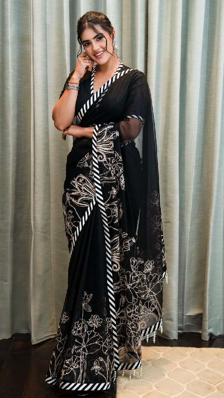 रिसेप्शन पार्टी में हॉट और सेसी लुक कैरी करने के लिए आप एक्ट्रेस की इस ब्लैक साड़ी को ऑक्सिडाइज्ड इयररिंग्स के साथ पहन सकती हैं।