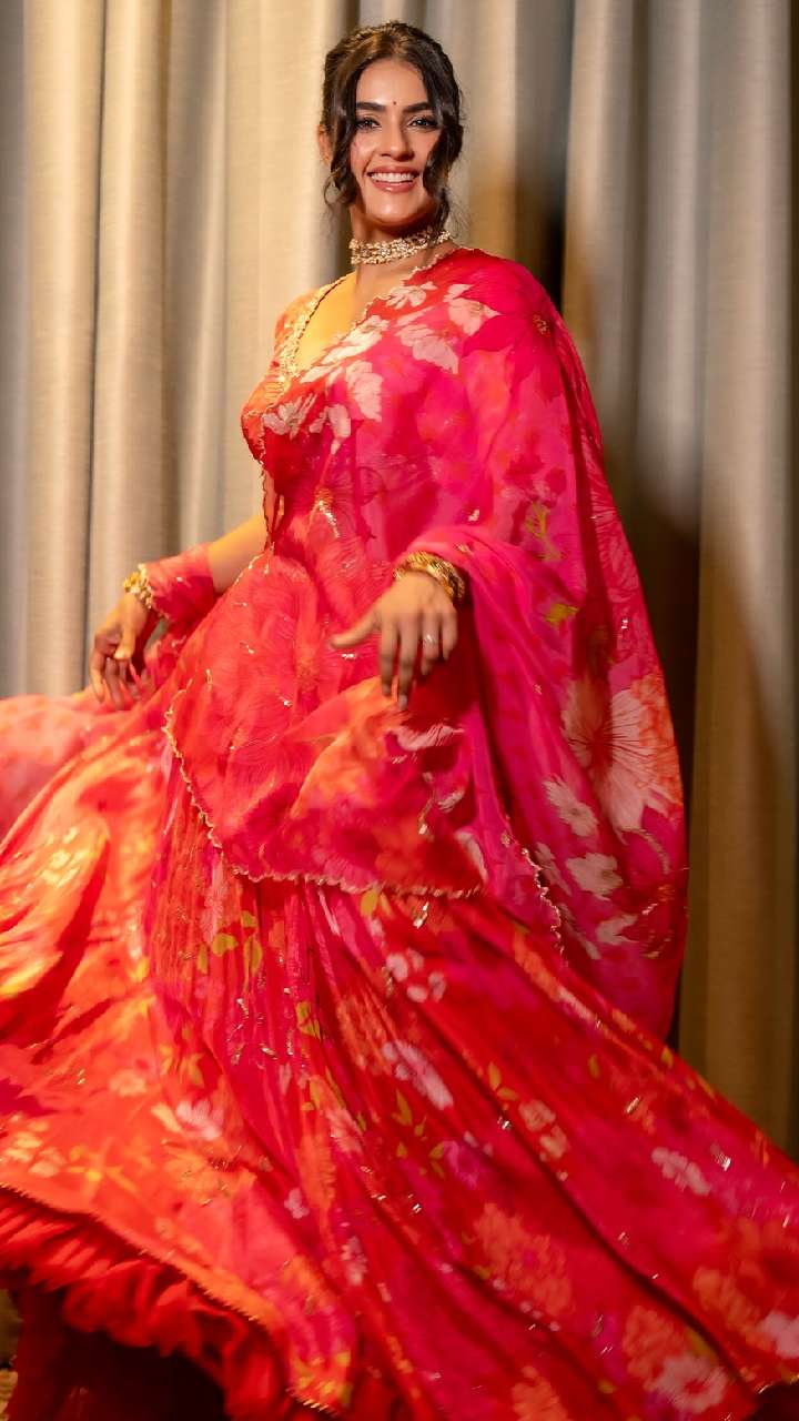 एक्ट्रेस ने मैसी बन के साथ स्टाइलिश फ्लोरल लहंगो को कैरी किया है, जो देखने में बेहद एलिगेंट लुक दे रहा है। यंग गर्ल्स फंक्शन में इस सूट को डिजाइनर हैवी लॉन्ग इयररिंग्स के साथ पहन सकती हैं।