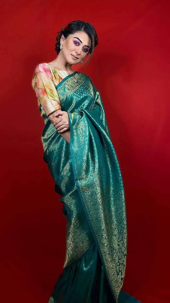 ग्रीन कलर की प्लेन साटन साड़ी गोल्डन वर्क ब्लाउज काफी ब्यूटीफुल लग रहा है। इसके साथ डार्क लिपस्टिक बोल्ड मेकअप टच दिया गया है।