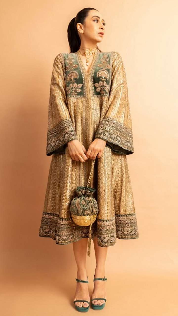 गोल्डन कलर के अफगानी जरदोजी ड्रेस में करिश्मा कपूर स्टाइलिश दिखाई दे रही हैं। ऐसी ड्रेस पार्टी में परफेक्ट लुक देती हैं।