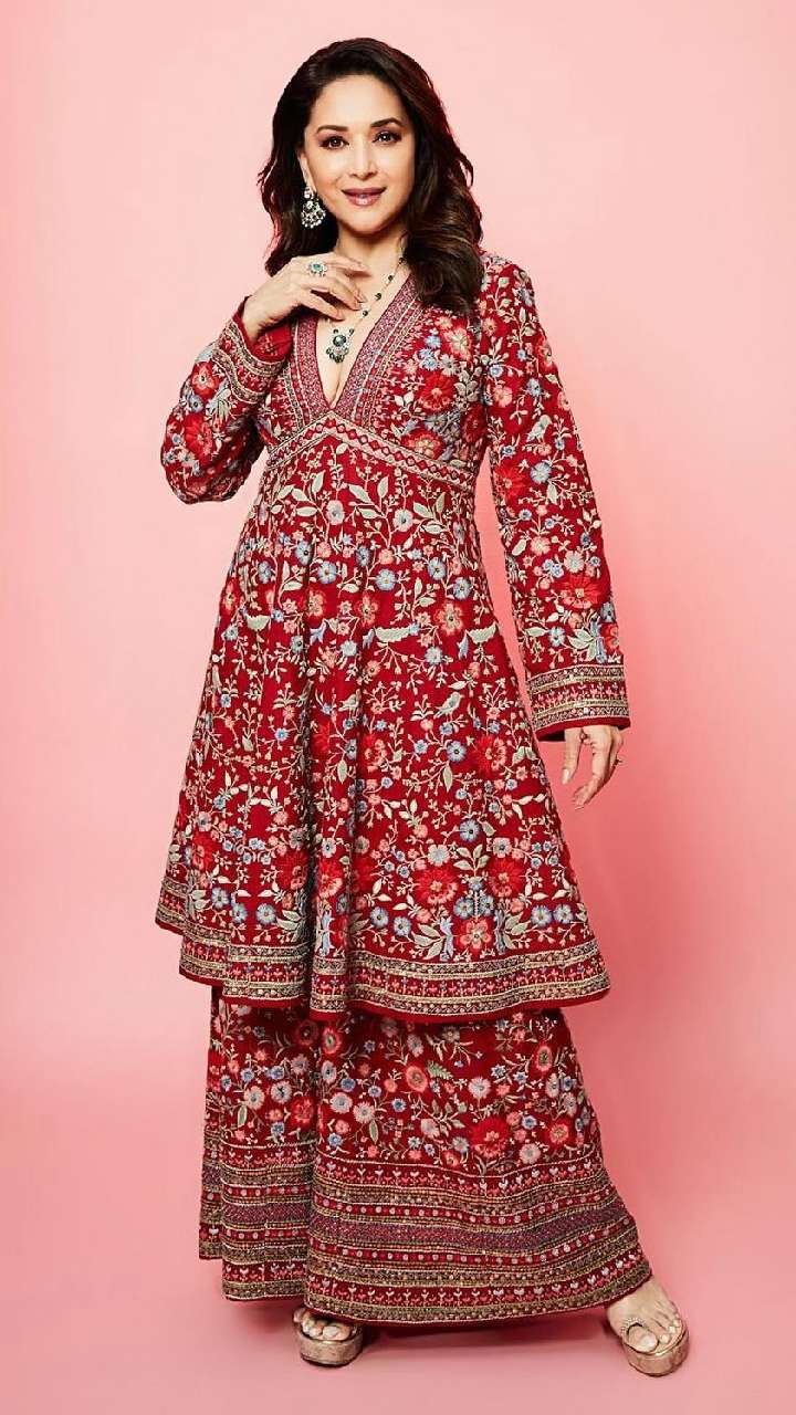 अनिता डोंगरे द्वारा डिजाइन माधुरी दीक्षित रेड कलर के एम्ब्रॉइडर्ड फ्लोरल कुर्ता सेट में बहुत खूबसूरत लग रही हैं।