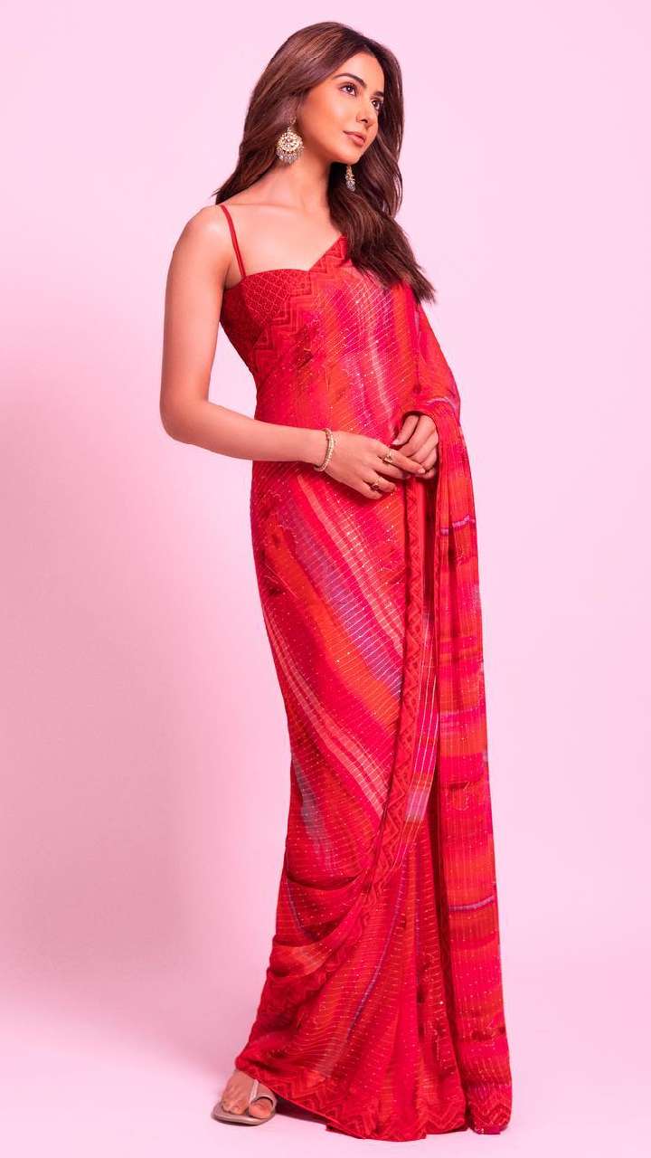 ज्यादातर एक्ट्रेस साड़ी पहनना बहुत पसंद करती हैं। ऐसे में रकुल प्रीत रेड कलर की पेंडोरा साड़ी में बला की खूबसूरत लग रही हैं।