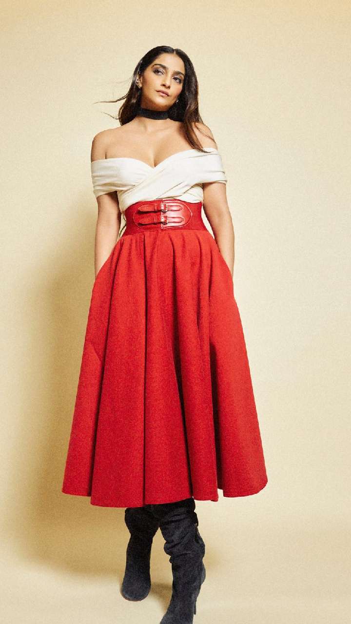 व्हाइट कलर का टॉप और रेड कलर के स्कर्ट में सोनम कपूर काफी हॉट लग रहीं हैं।