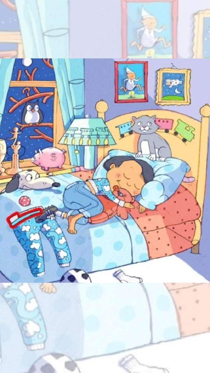 तस्वीर में आपको सोती हुई बच्ची नजर आ रही होगी। बच्ची के पास, एक कुत्ता, एक बिल्ली और खिड़की पर एक उल्लू बैठा हुआ है। इसमें एक टूथब्रश भी छिपा हुआ है।
