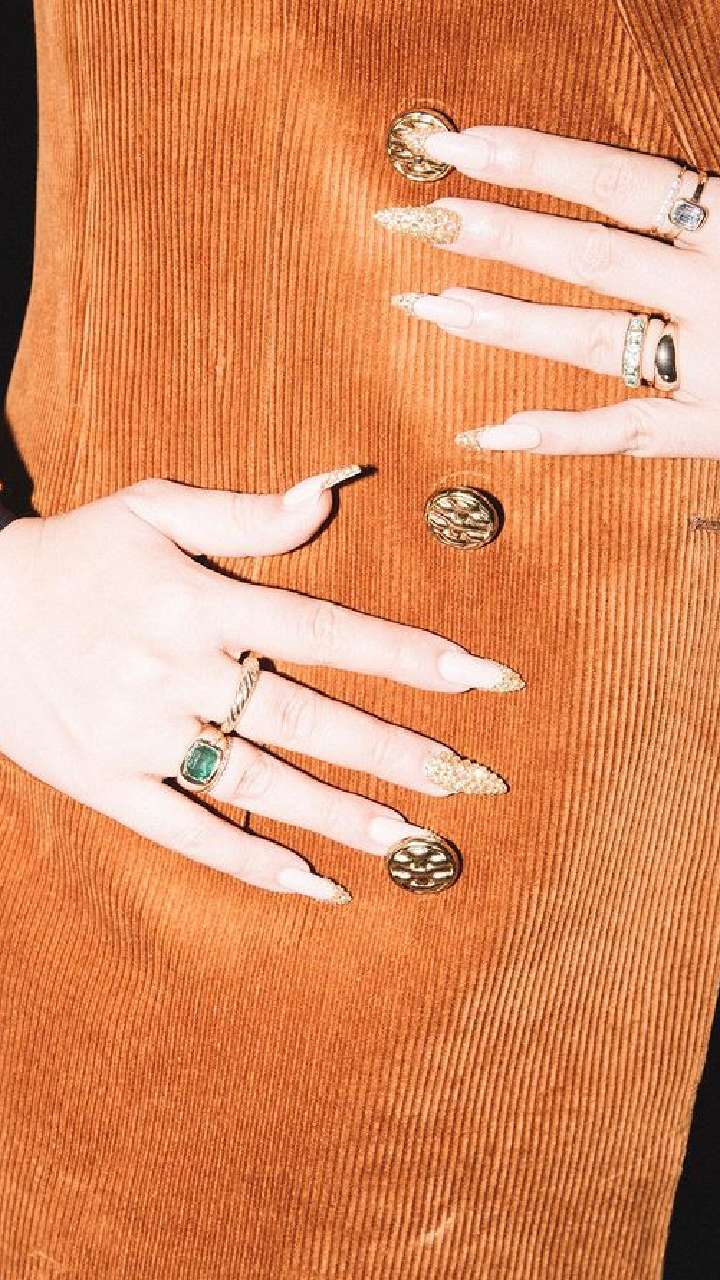 इस आउटफिट के साथ हुमा कुरैशी ने गोल्डन शिमरी नेल आर्ट करवाया है।