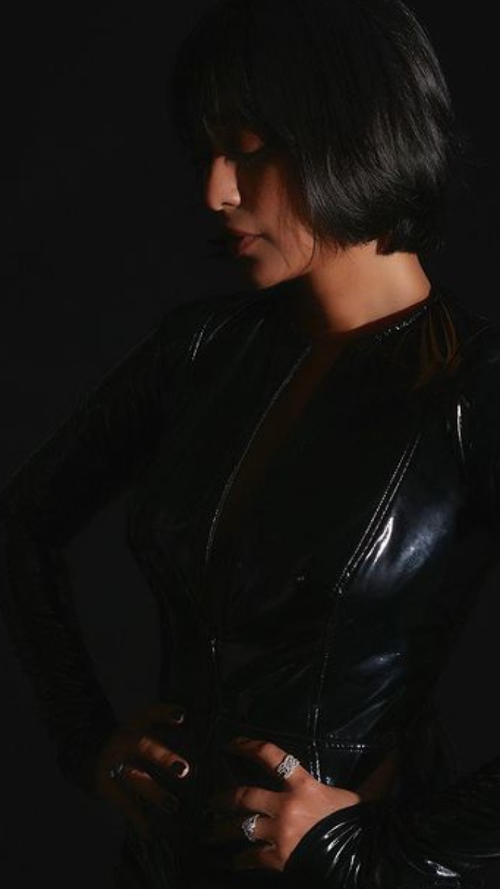 ऑल ब्लैक लुक के साथ एक्ट्रेस ने बोल्ड मेकअप अप्लाई किया है और सयानी ने कैट आई लाइनर लगाया हुआ है।