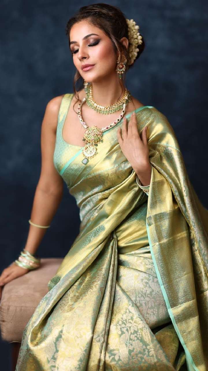 अगर आप किसी वेडिंग फंक्शन में साड़ी पहनने का विचार बना रही हैं, तो शहनाज गिल की यह कांजीवरम साड़ी आपके लिए बिल्कुल परफेक्ट होगी।