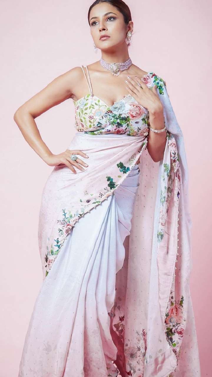 अगर आप शादी या किसी पार्टी में कुछ शानदार पहनना चाहती हैं, तो शहनाज गिल की यह सफेद मोती वर्क वाली साड़ी बिल्कुल परफेक्ट रहेगी।