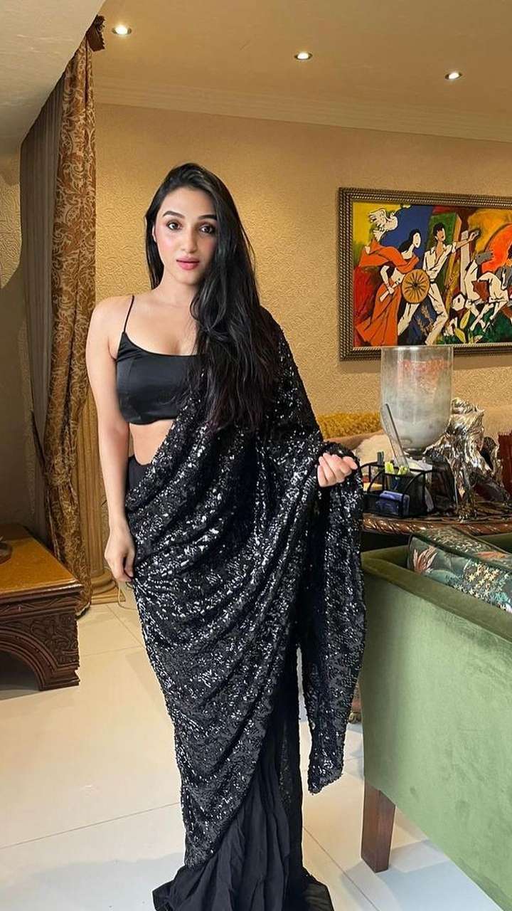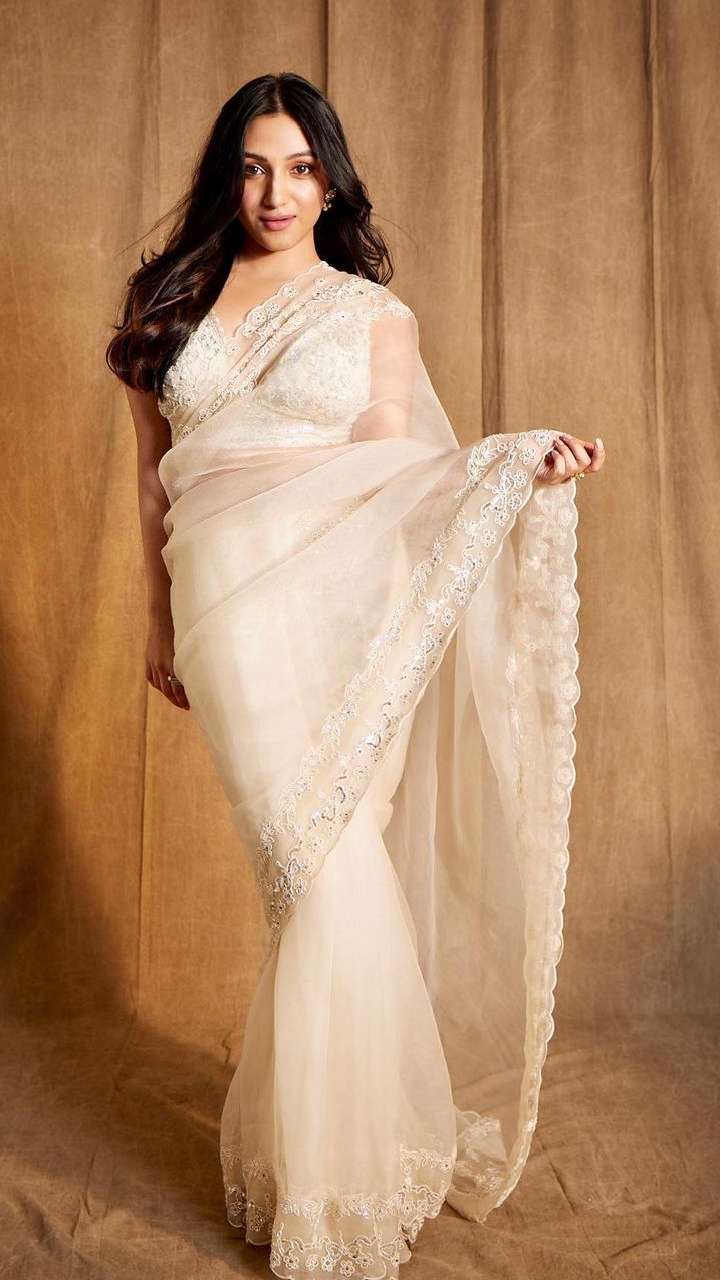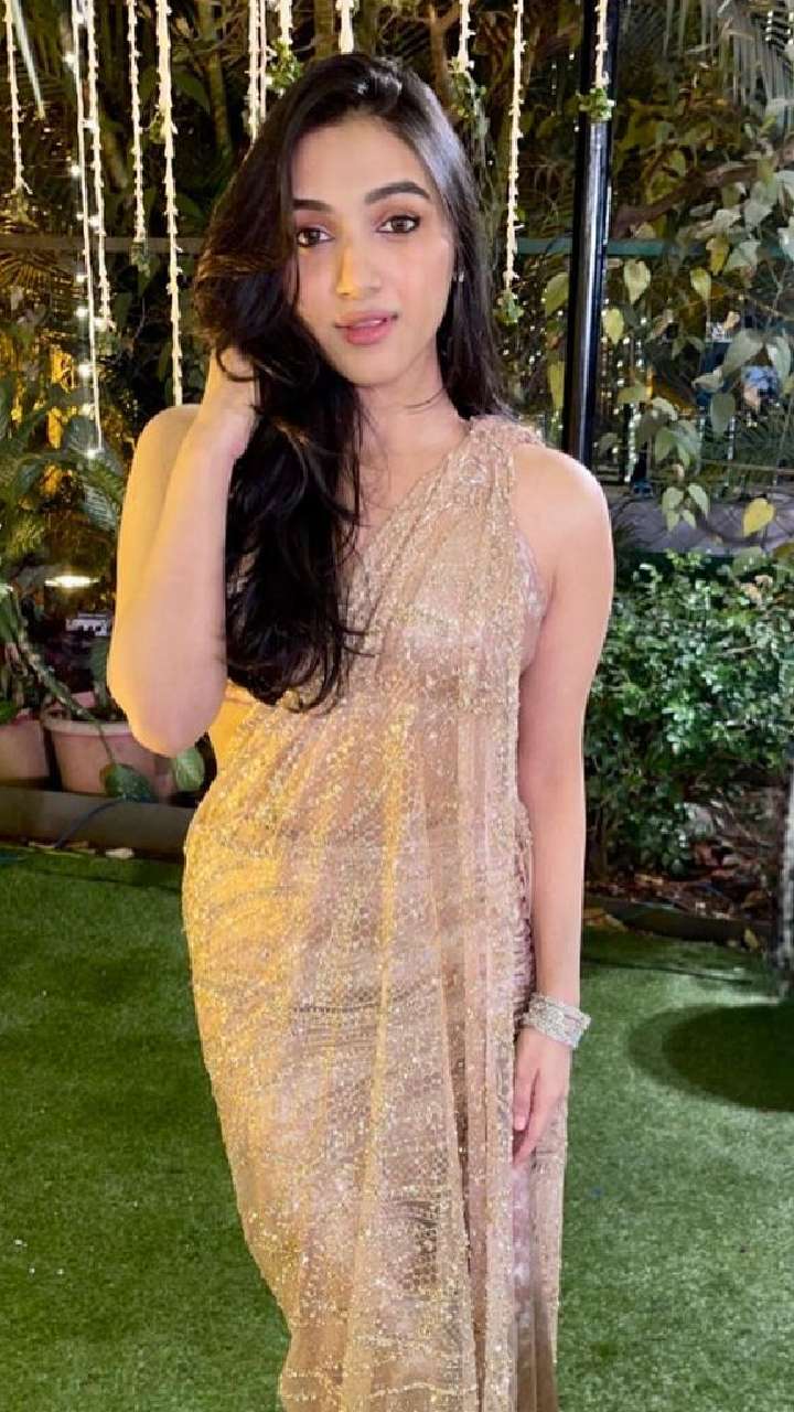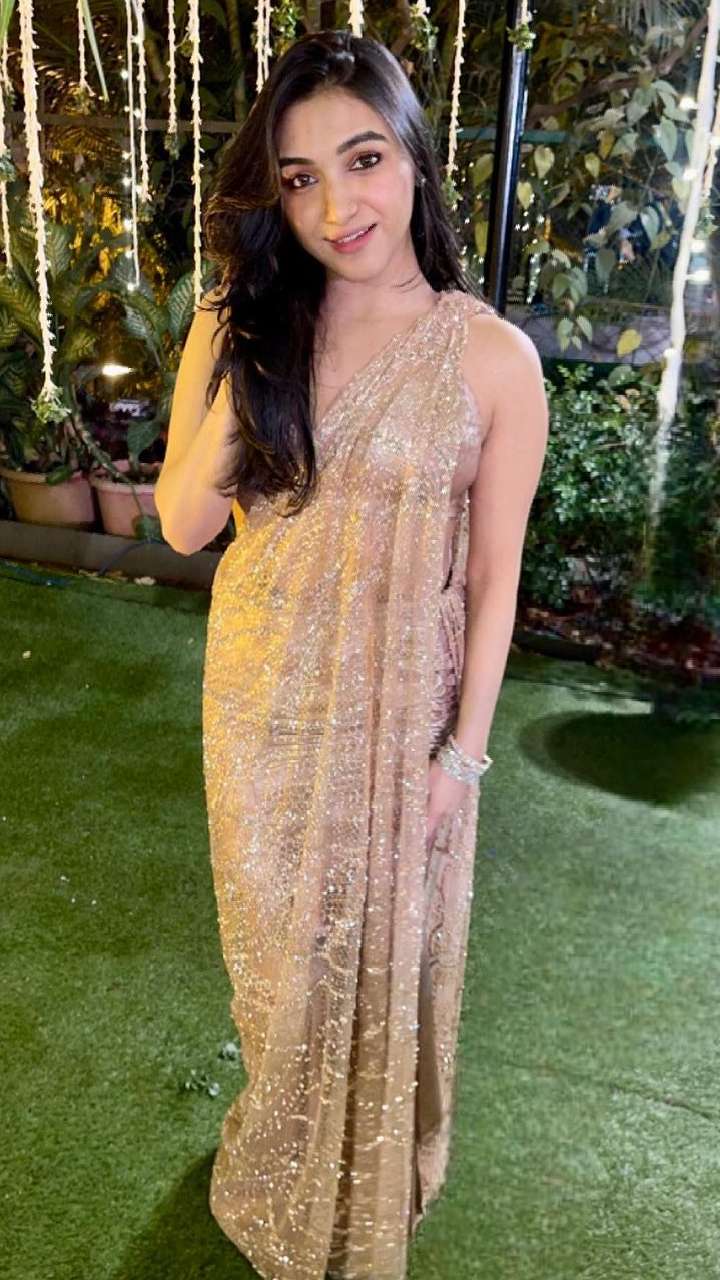 बॉलीवुड एक्ट्रेस तनीषा संतोषी गोल्डन साड़ी में बला की खूबसूरत लग रही हैं।