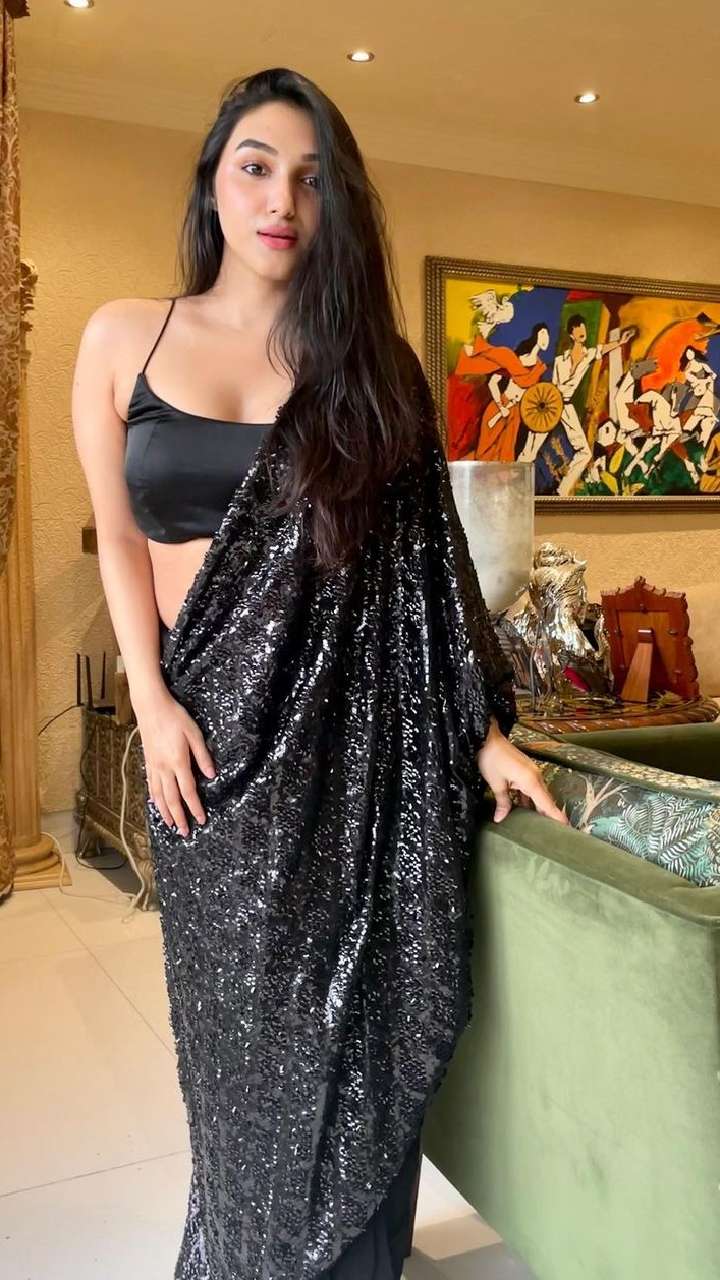 ब्लैक कलर की साड़ी और स्लीवलेस ब्लाउज में एक्ट्रेस पल्लू गिराते हुए बेहद हॉट अंदाज में नजर आ रही है।
