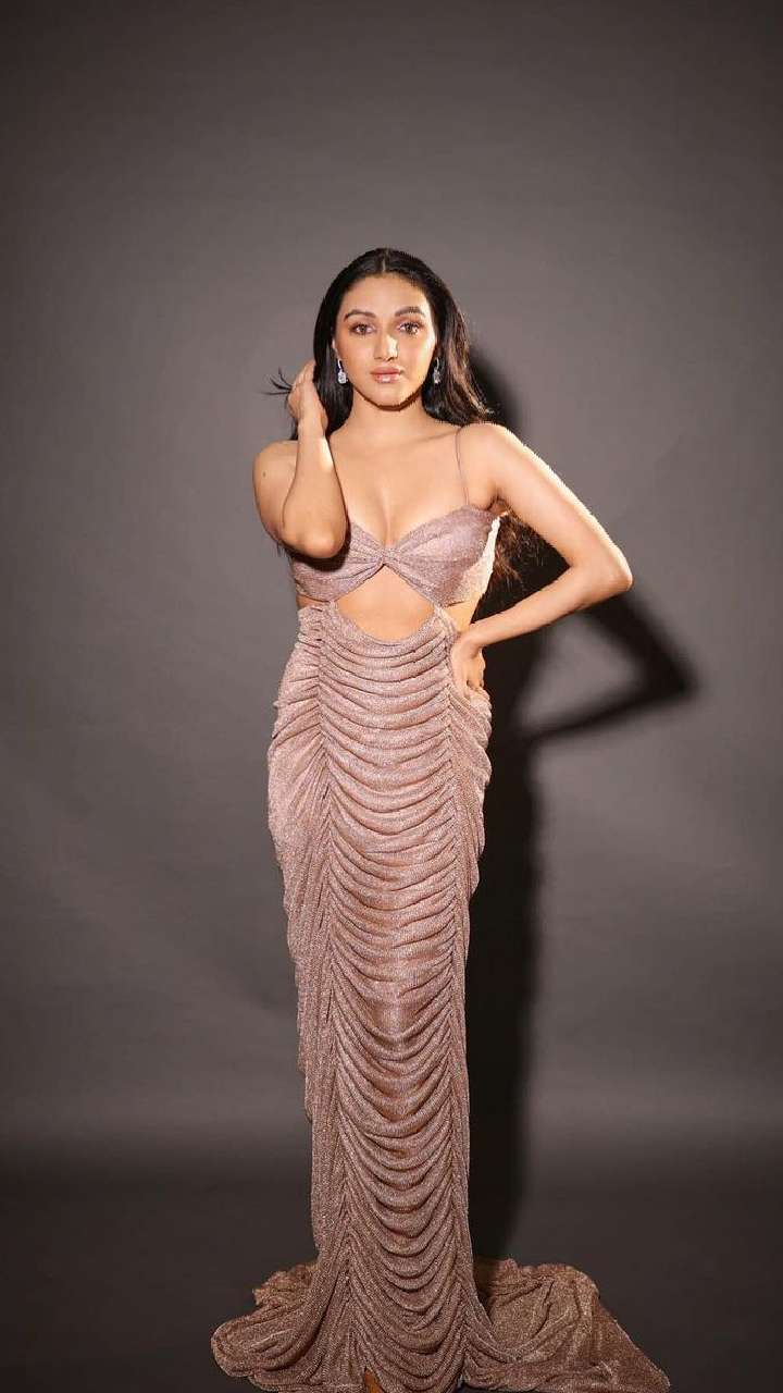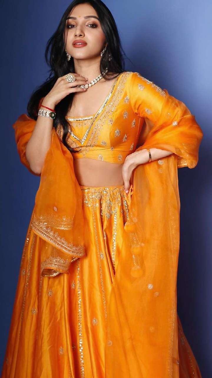 एक्ट्रेस ऑरेंज कलर के लहंगे चुनरी में ग्लॉसी लिपस्टिक लगाए हुए बेहद ग्लैमरस लुक देती देखी जा सकती है।