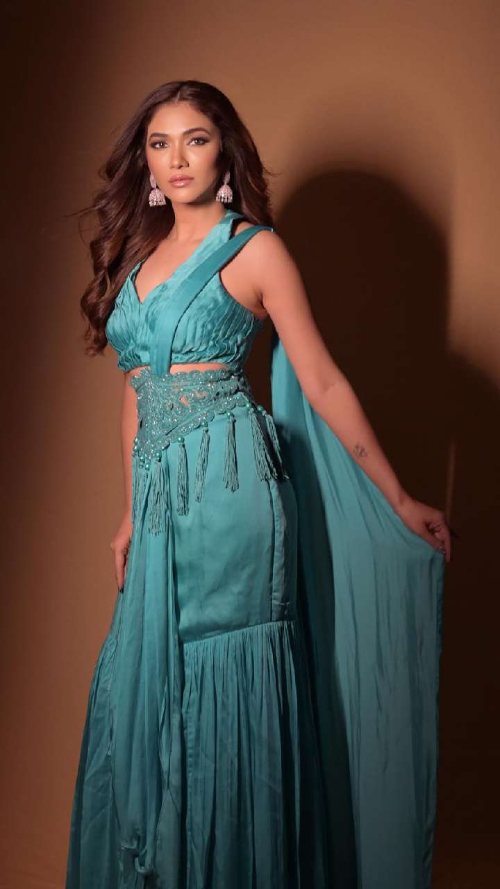 ब्लू कलर के इंडो-वेस्टर्न लुक में रिद्धिमा पंडित का ये लुक काफी ज्यादा ट्रेंडी है। इस लुक के साथ एक्ट्रेस ने ग्लोसी मेकअप किया है।