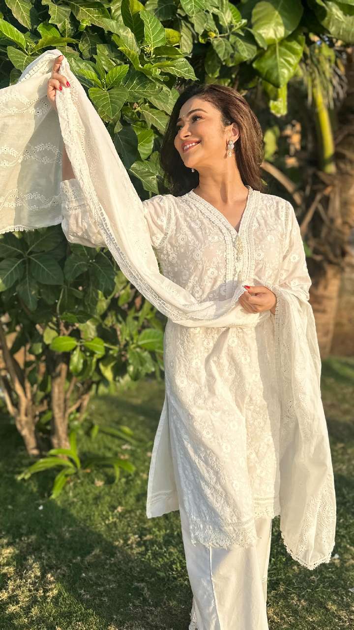व्हाइट कलर के सलवार सूट में रिद्धिमा पंडित का ये लुक बहुत ही सिंपल और सुंदर है। एक्ट्रेस का ये लुक इस उत्सव के लिए परफेक्ट है।