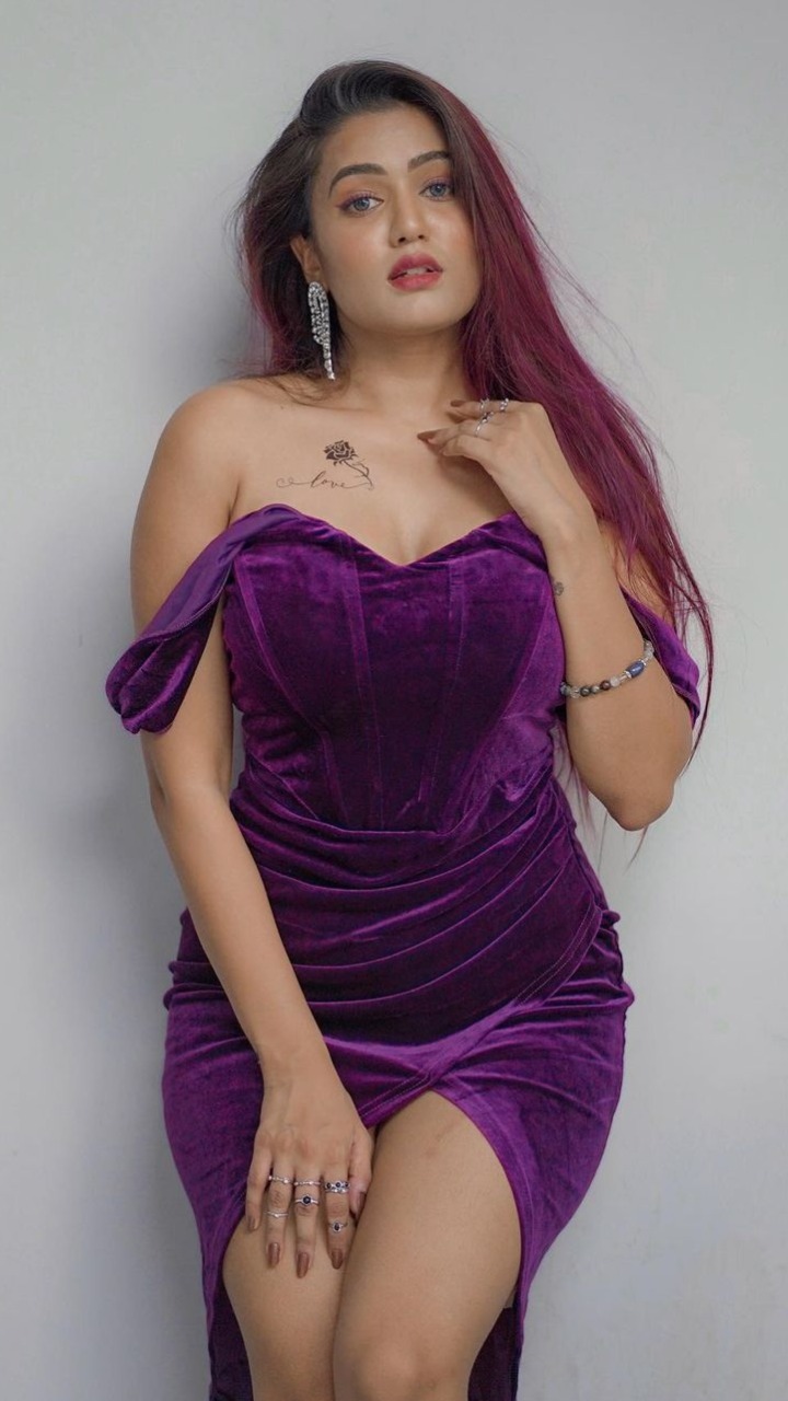 पर्पल कलर की बोल्ड ड्रेस में एक्ट्रेस बेहद खूबसूरत और बोल्ड लग रही है।
