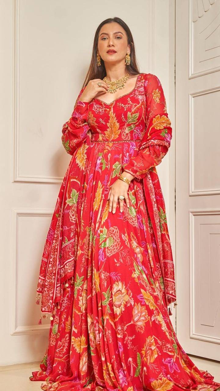 गौहर इंडस्ट्री की फैशनिस्टा हैं, एक्ट्रेस रेड कलर का कढ़ाई वाला एम्ब्रॉयडर्ड अनारकली सेट पहना हुआ हैं।