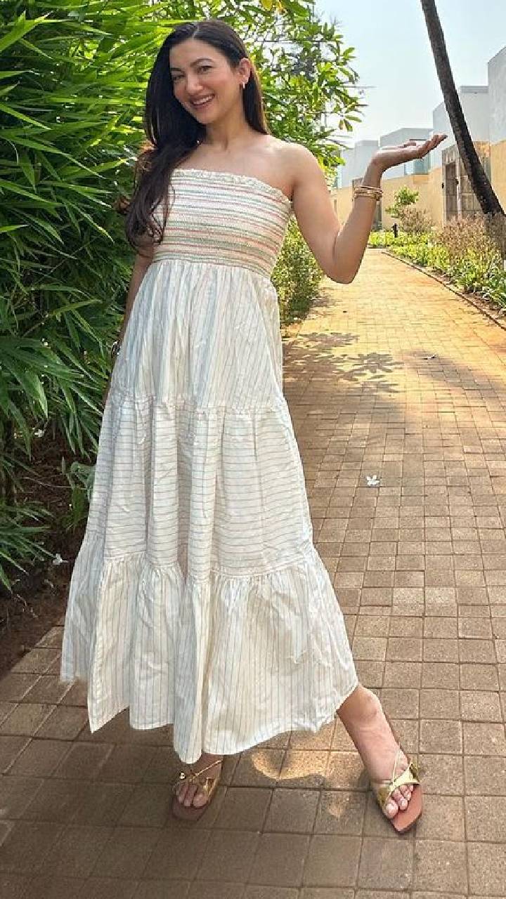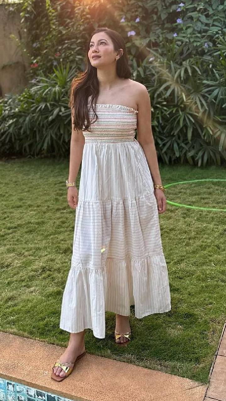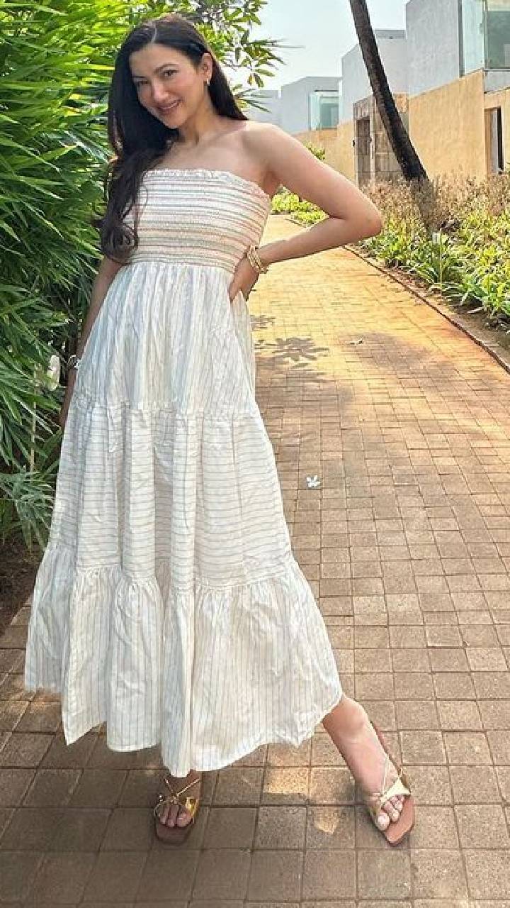 तस्वीर में गौहर ने क्रीम कलर का टियर्ड ऑफ शोल्डर ड्रेस पहना हुआ है।