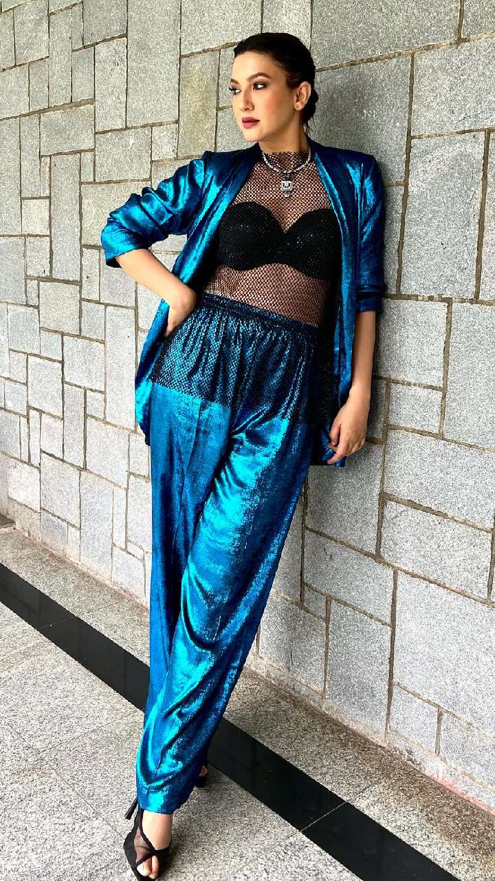 ब्लू कलर के शाइनी पेंट ब्लेजर और जालीदार टॉप में गौहर बेहद किलर लग रही हैं। नाइट पार्टीज में ये ड्रेस आपको अट्रैक्टिव लुक देगी।