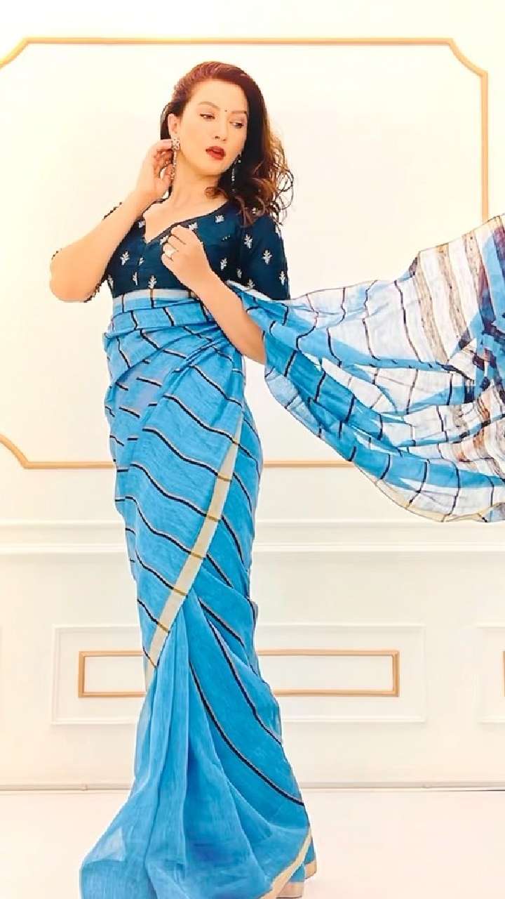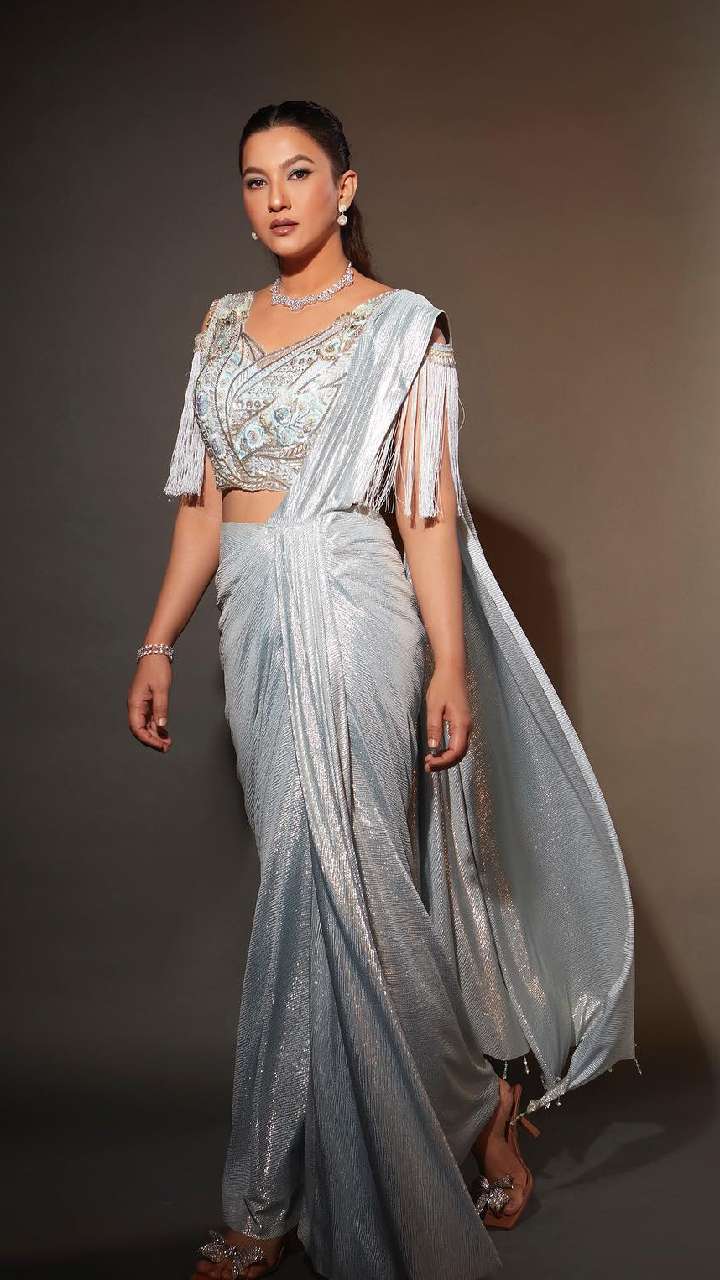 किटी पार्टी में बोल्ड और यूनिक दिखने के लिए आप गौहर के जैसी प्लेन साड़ी विद ब्लेजर लुक को भी कॉपी कर सकती हैं।