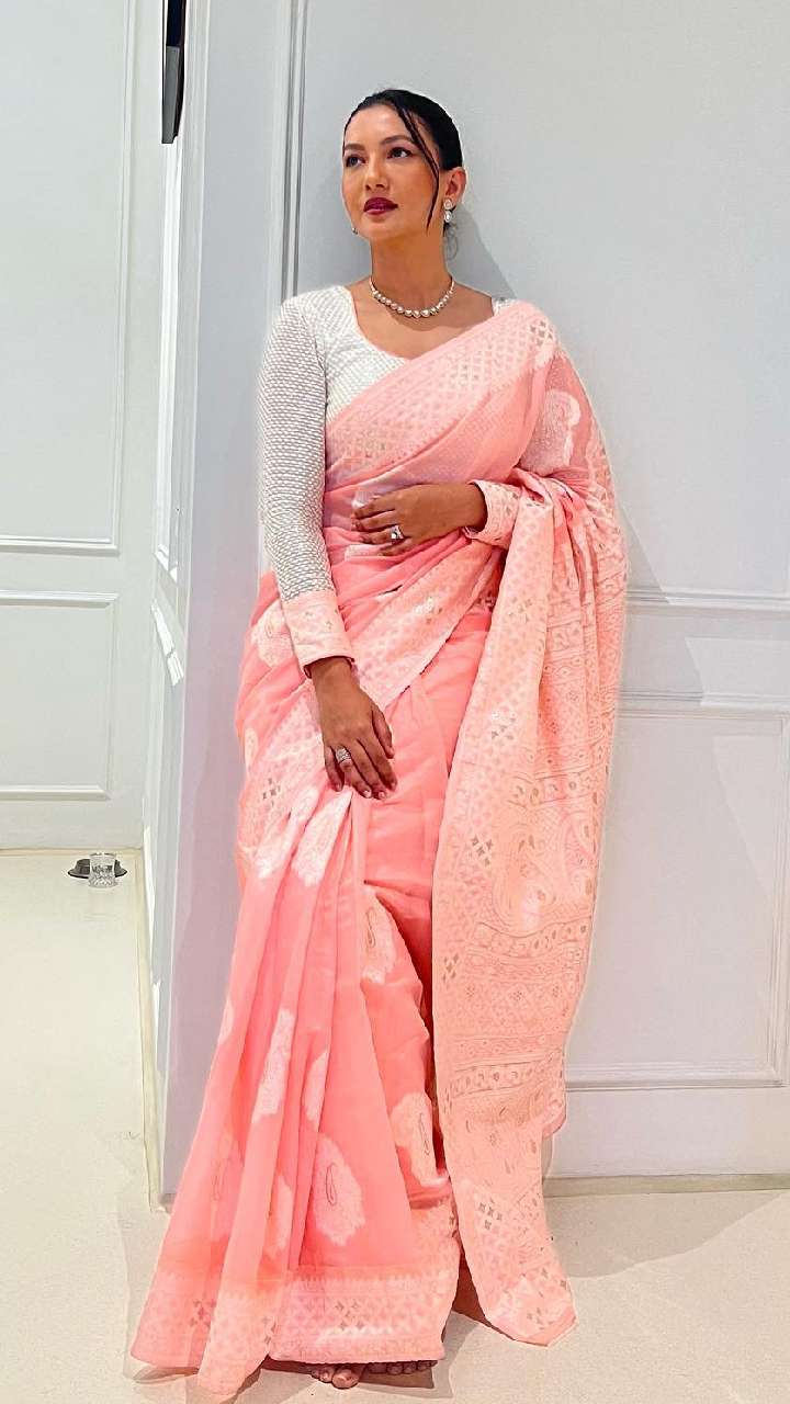 हाल में एक्ट्रेस ने पीच कलर की प्लेन साटन साड़ी पर्ल वर्क जीरो नेक ब्लाउज में अपना लेटेस्ट लुक शेयर किया है। जो मॉम्स के लिए परफेक्ट लुक है।