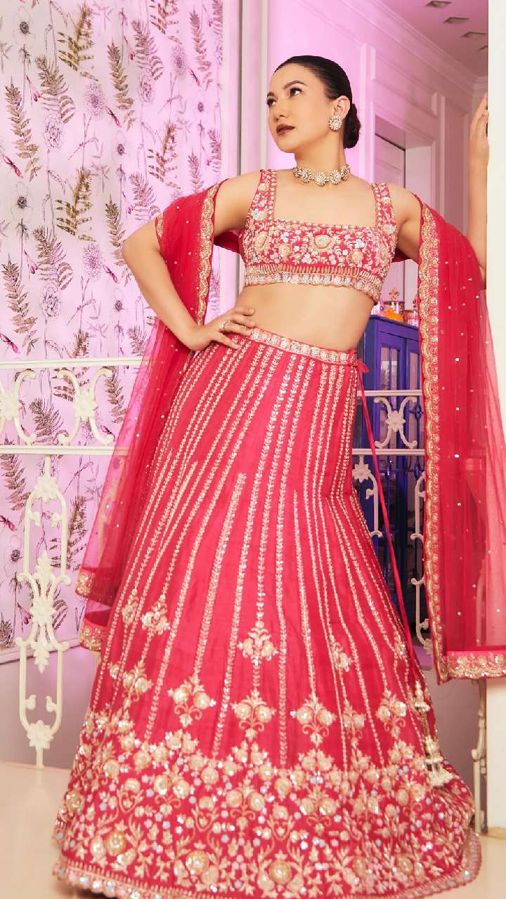 एक्ट्रेस का पिंक हैवी वर्क लहंगा स्क्वेयर नेक कट स्लीव्स चोली आपके वेडिंग लुक में चार चांद लगा देगी। इसके साथ बन हेयर स्टाइल ग्लॉसी मेकअप टच दिया जा सकता है।