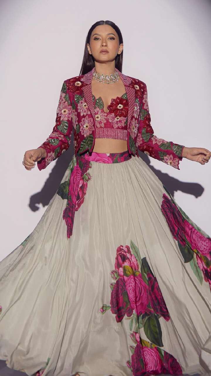 अभिनेत्री का व्हाइट बेस के साथ फ्लोरल लहंगा हैवी वर्क चोली और शार्ट जैकिट लुक काफी ग्लैमरस लग रहा है। इसे यंग गर्ल्स जरूर कॉपी करें।