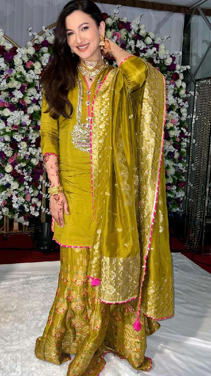 यदि आप रंग-बिरंगे कलर नहीं पहनना चाहती हैं। तो गौहर के व्हाइट गोल्डन सितारा वर्क वाले ब्यूटीफुल लहंगे को ट्राई कर सकती हैं।