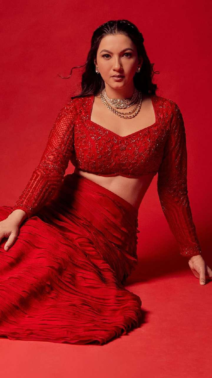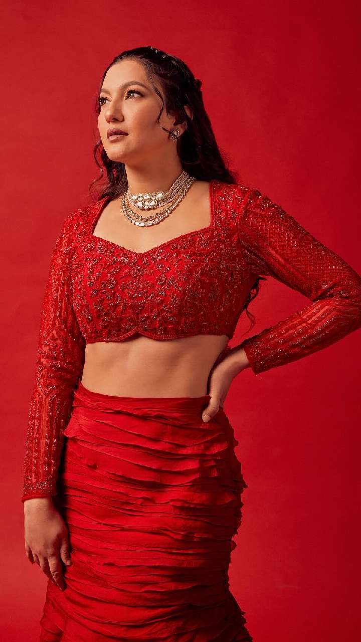 रेड कलर के इस आउटफिट में गौहर खान बहुत खूबसूरत लग रहीं हैं। गौहर ने इस आउटफिट के साथ शानदार नेकलेस पेयर किया है।