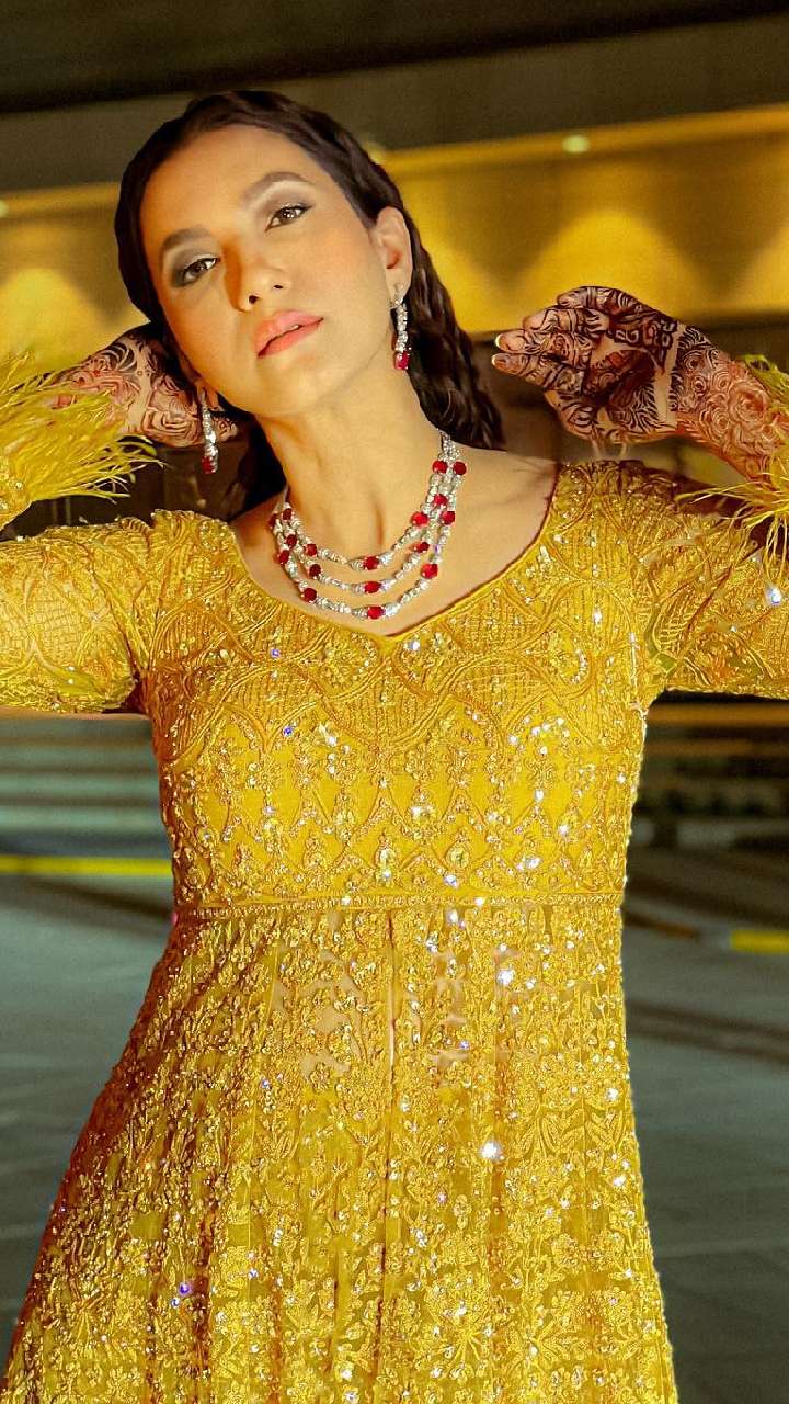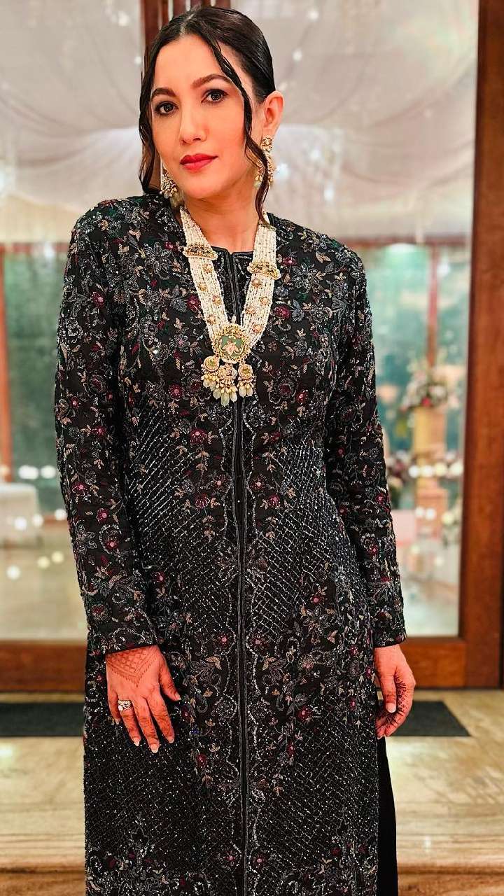 ब्लैक कलर के सूट के साथ गौहर खान ने हार पेयर किया है। एक्ट्रेस का हर लुक काफी ज्यादा रॉयल है।