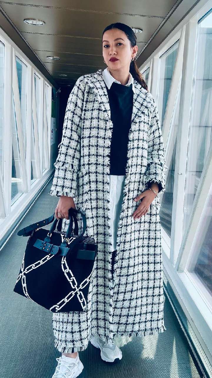 गौहर का ट्रेंच चेक प्रिंट कोट ब्लैक स्वेटर व्हाइट डेनिम जींस वाला विंटर लुक काफी स्मार्ट लग रहा है।