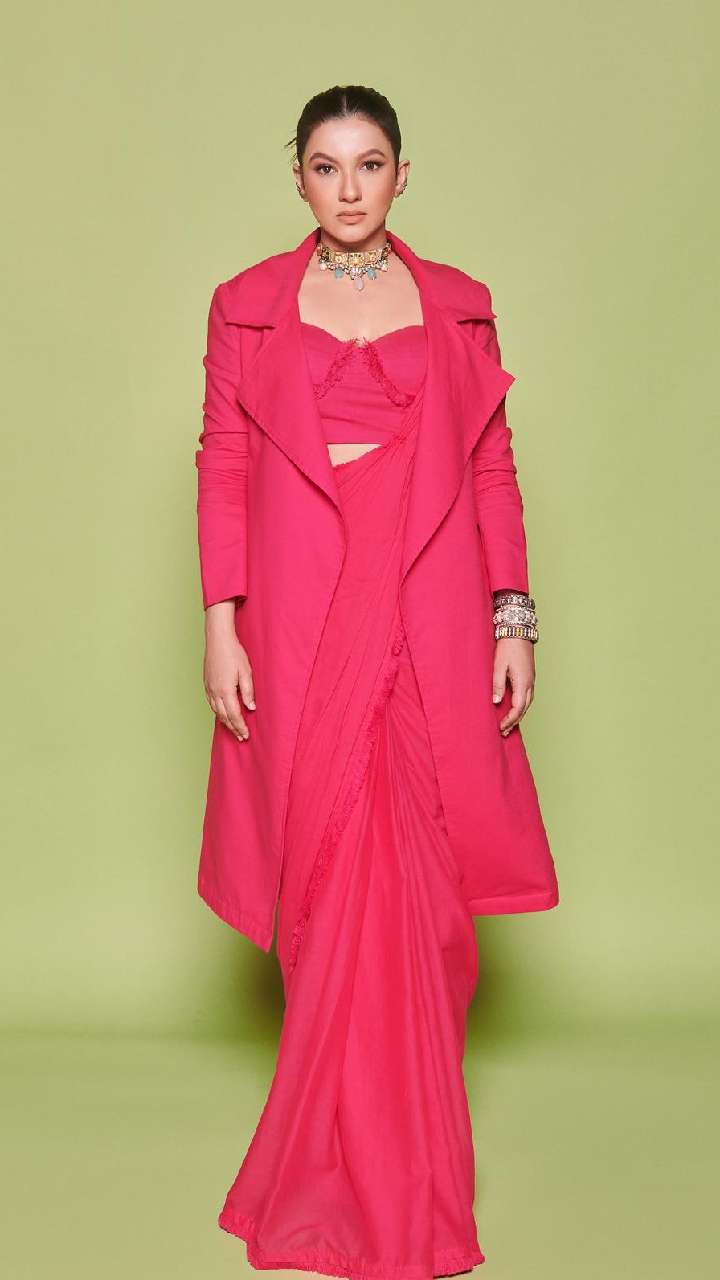 आप भी किसी फंक्शन में एक्ट्रेस के इस साड़ी संग लांग ब्लेजर लुक को कैरी करके खुद को अट्रैक्टिव लुक दे सकती हैं।
