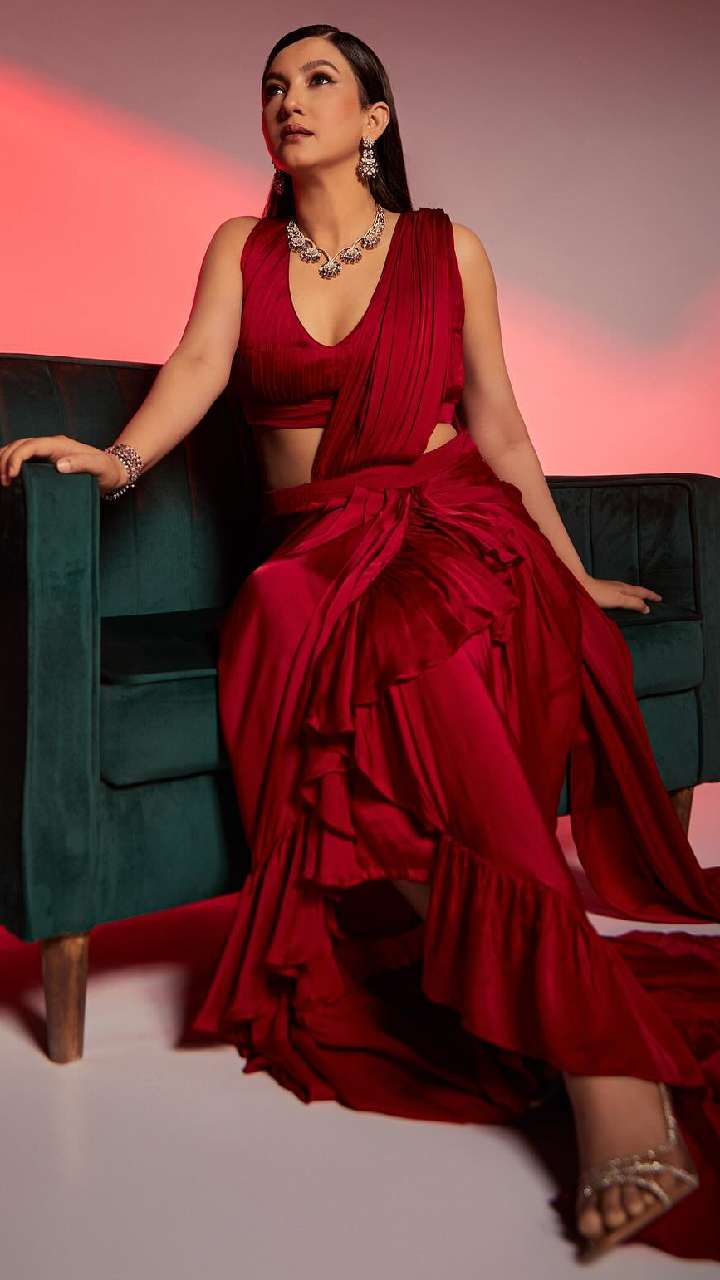 अगर आप शादी या पार्टी में साड़ी पहनना चाहती हैं, तो इस रेड कलर की फ्रिल साड़ी को रीक्रिएट करके महफिल की जान बन सकती हैं। ऐसी साड़ियां पार्टी में हॉट लुक देती हैं।