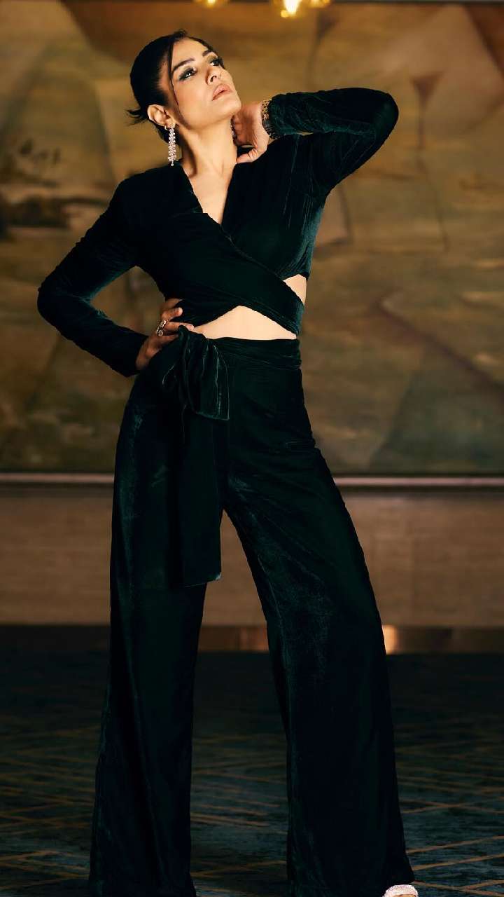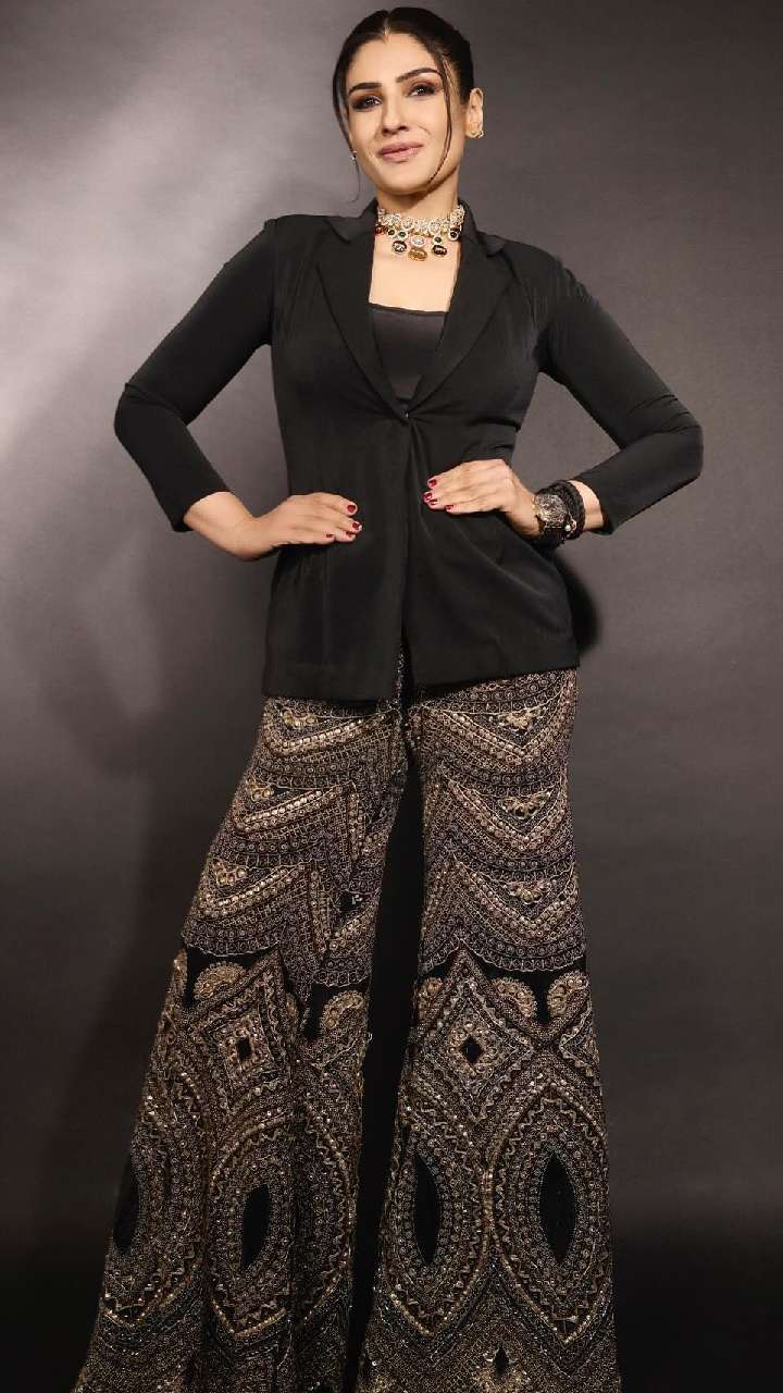 Raveena ने प्रिंटेड प्लाजो के साथ स्टाइलिश ब्लैक ब्लेजर को कैरी किया है। एक्ट्रेस के नेकलेस से आउटफिट में चार-चांद लग रहे हैं। आप घर के फंक्शन या पार्टी में इस लुक को कॉपी कर सकती हैं।