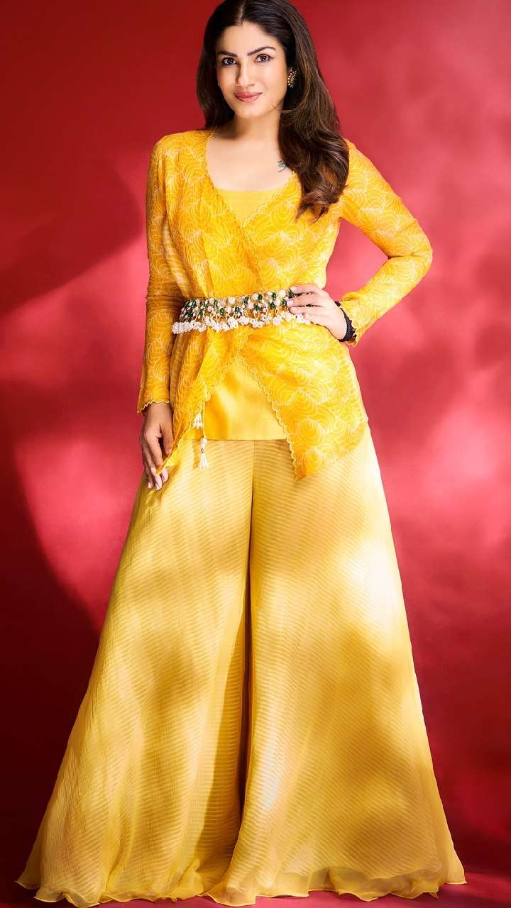 रवीना इस येलो कलर के प्लाजो सूट में अपनी उम्र से काफी कम दिखाई दे रही हैं। नॉर्मल हैंगआउट या फंक्शन में आप इस सूट को हाई हील्स और डिजाइनर इयररिंग्स के साथ ट्राई कर सकती हैं।