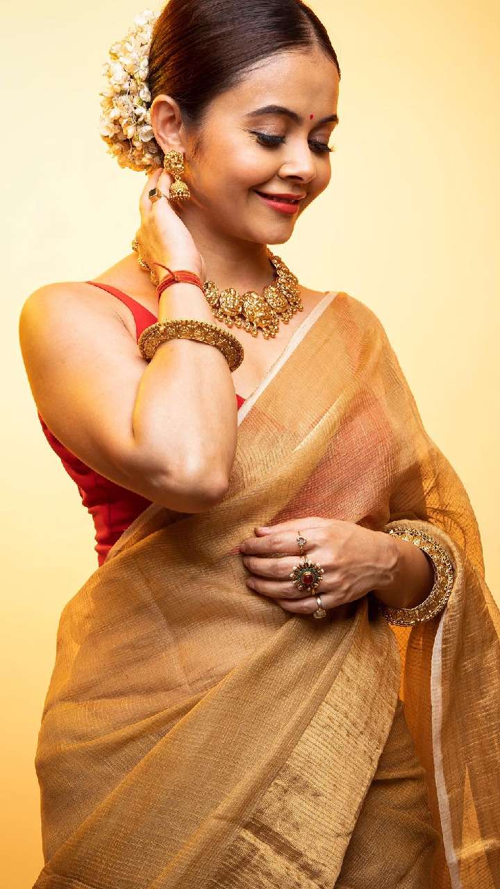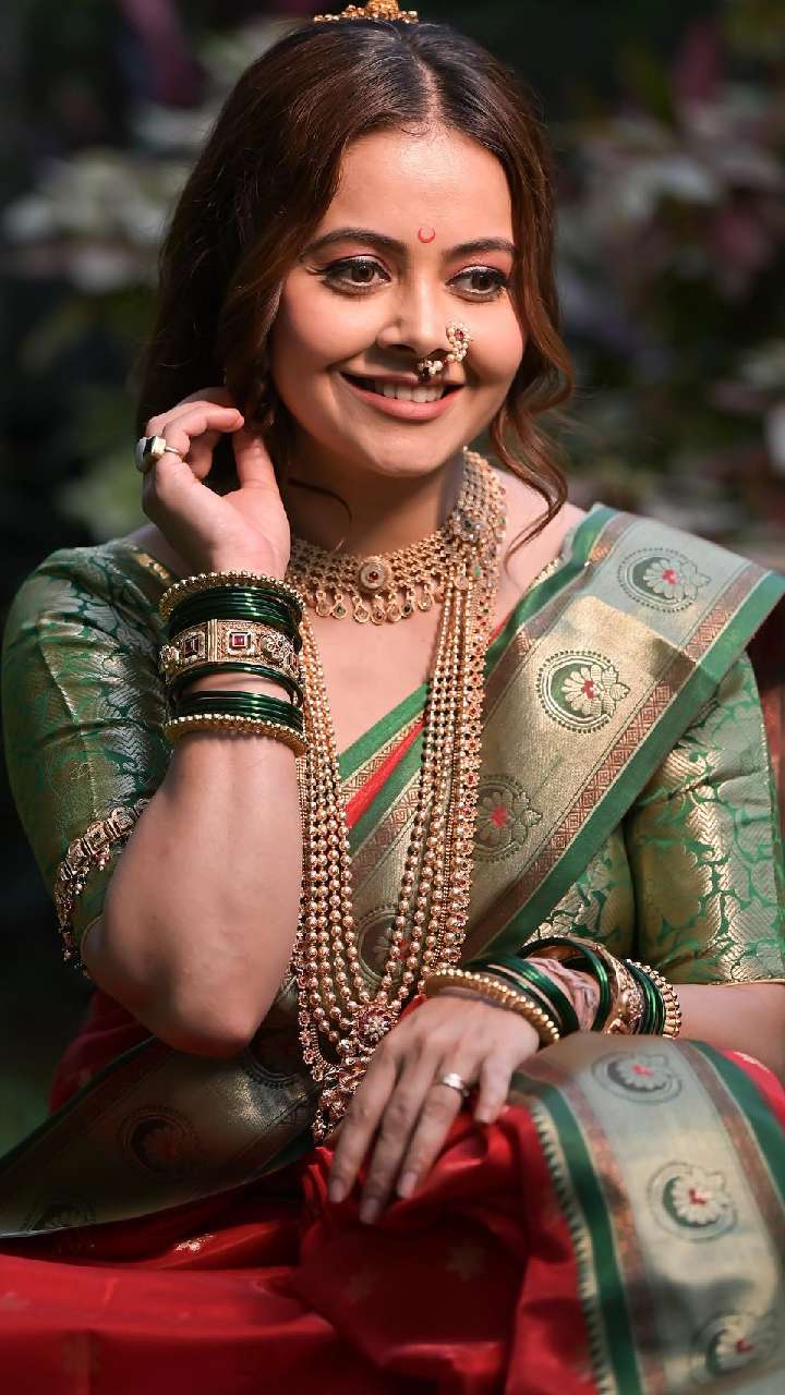 इस गुड़ी पड़वा आप देवोलीना की बनारसी जरी वर्क साड़ी माथा पट्टी लांग नेकपीस से खुद को खूबसूरत बना सकती हैं।