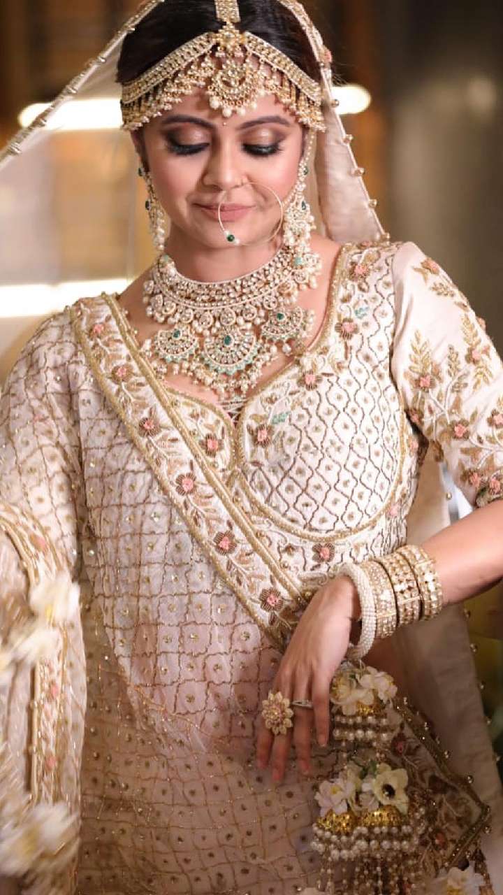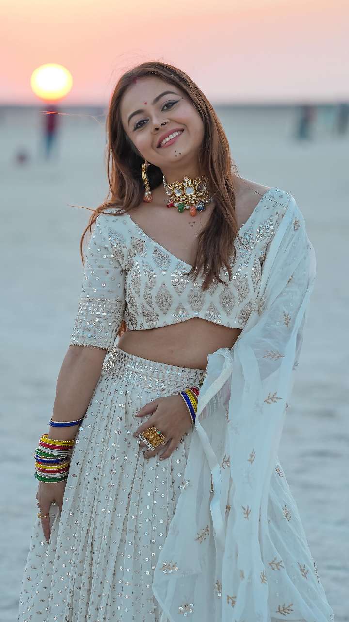 आप चाहे तो देवोलीना के ऑल व्हाइट मिरर वर्क लहंगे को भी ट्राई कर सकती हैं। ये आपको एकदम खूबसूरत लुक देगा।