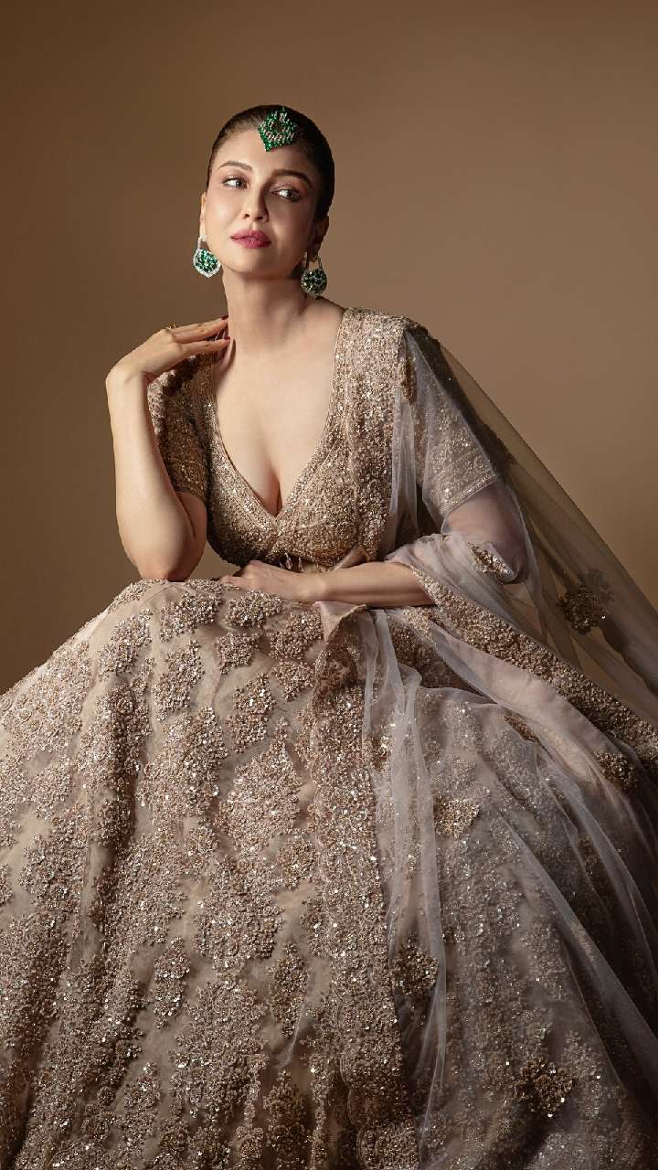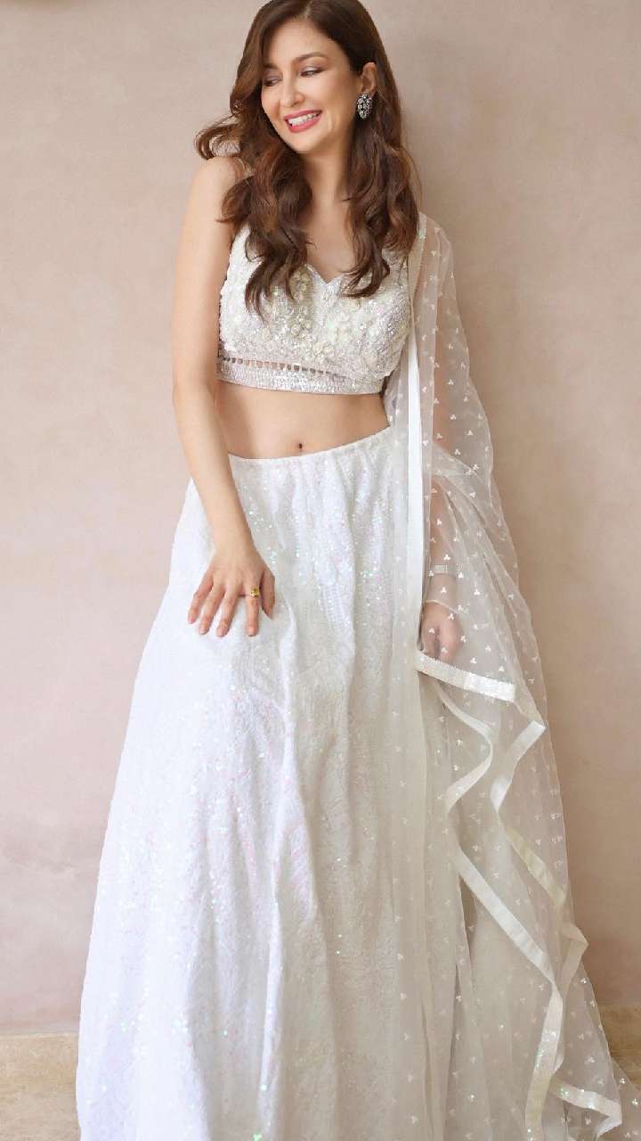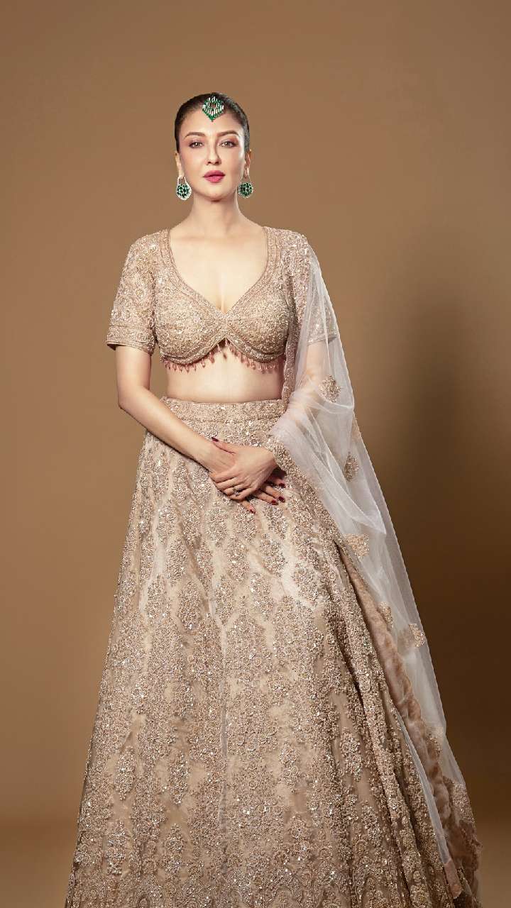 एक्ट्रेस का शिमरी बेज कलर लहंगा डीप नेक चोली लुक कातिलाना लग रहा है। ब्राइडल भी इसे सगाई में अपना लुक बना सकती हैं।