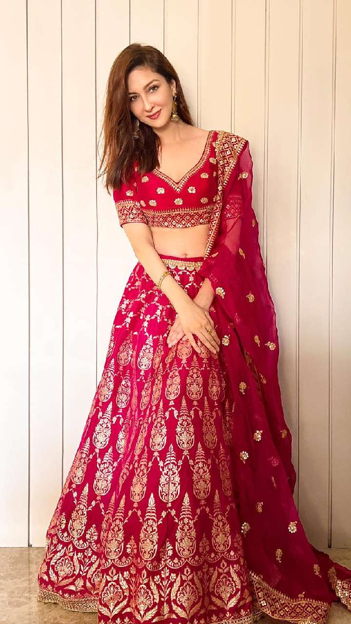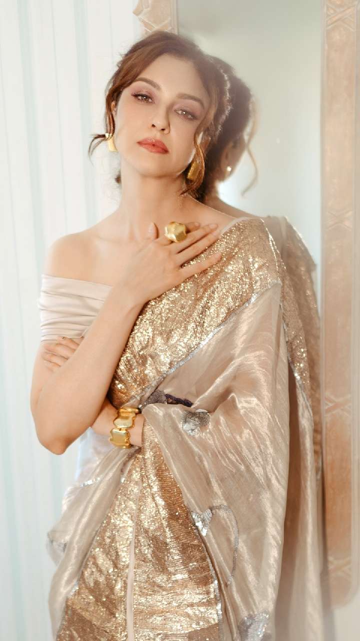 अभिनेत्री का गोल्डन शिमरी वर्क लहंगा ब्रॉड नेक कट स्लीव्स चोली लुक अट्रैक्टिव लुक दे रहा है। इसमें आपकी हर कोई तारीफ करेगा।