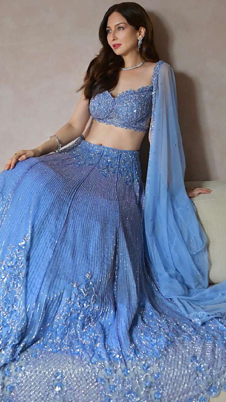 सौम्या टंडन ब्लू कलर के क्रैप वर्क सिल्वर वर्क लहंगे में बला की खूबसूरत लग रही हैं। इसके साथ स्लीक सा चोकर नेकपीस काफी जंच रहा है।