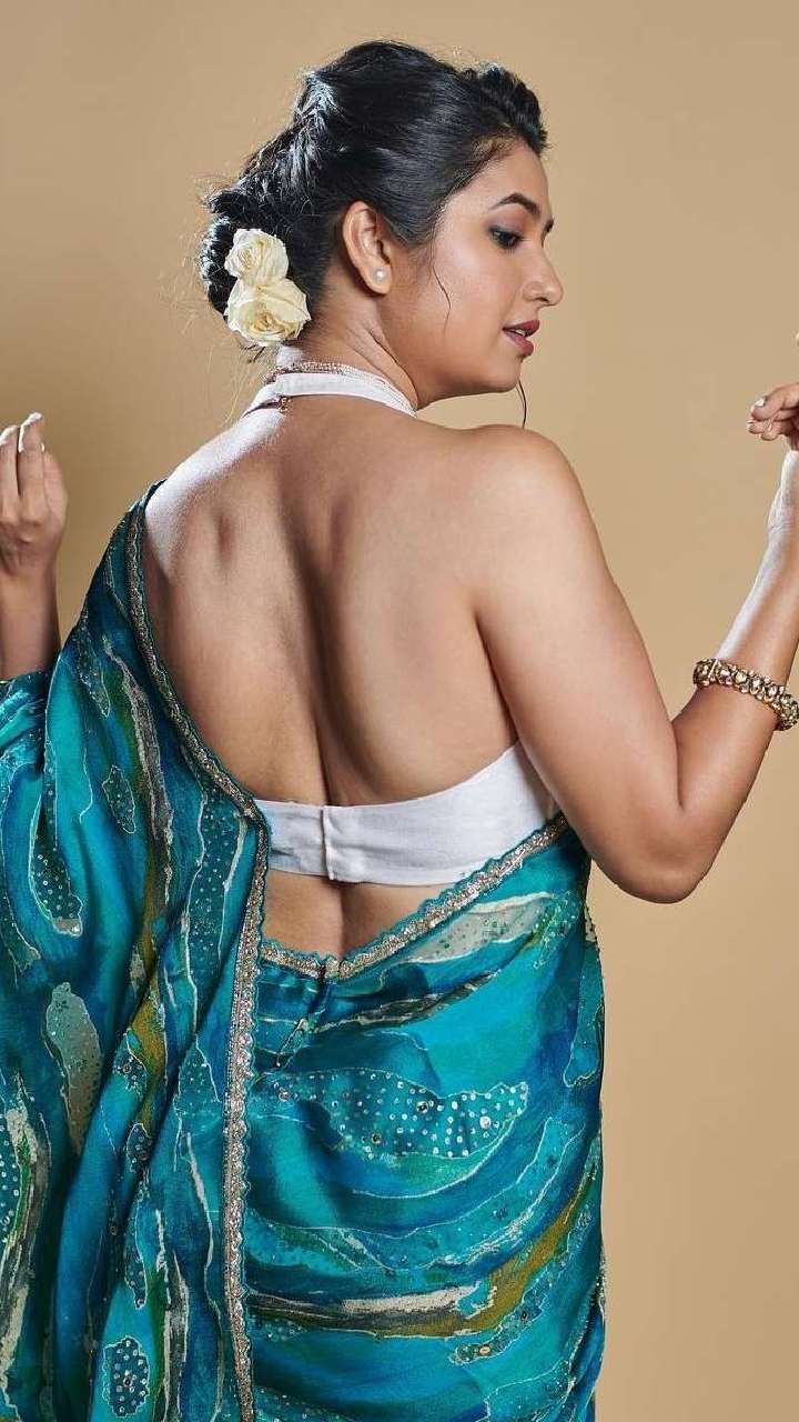 आप लाइट वेट साड़ी के साथ एक्ट्रेस के बैकलेस हैंगिंग ब्लाउज को कैरी करें। साथ ही, मेसी बन हेयर स्टाइल आपके ब्लाउज लुक में चार चांद लगा देगा।