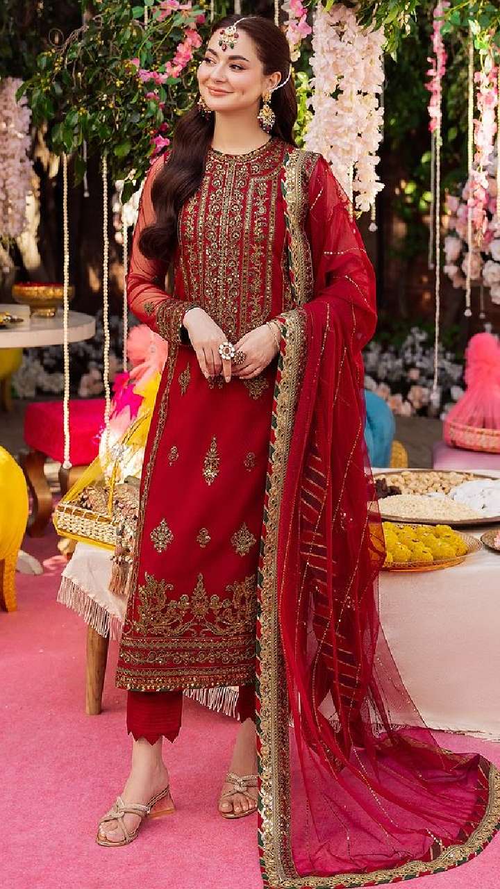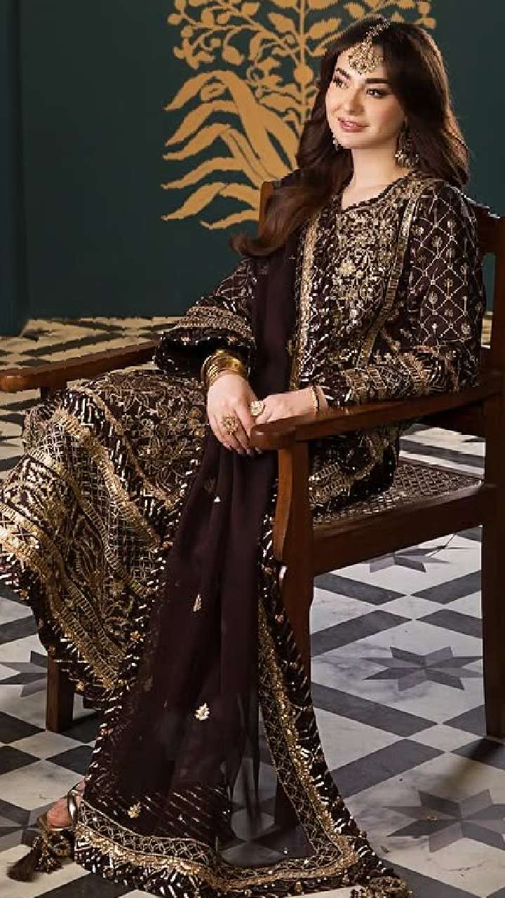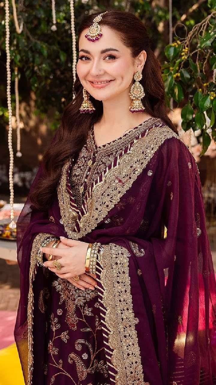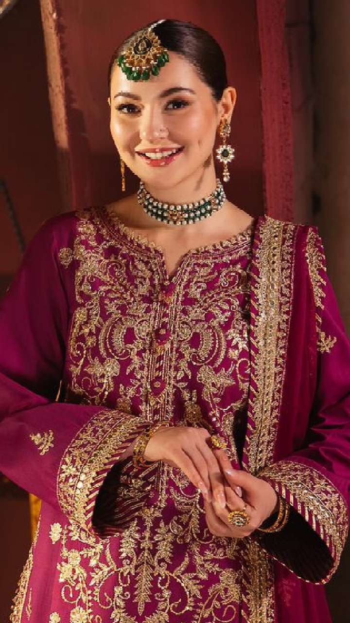 अगर आप वलीमे में कुछ ज्यादा शाही और एलिगेंट लुक चाहती हैं, तो एक्ट्रेस का यह मजेंटा सूट एक अच्छा ऑप्शन है। एंब्रॉयडरी वाला यह सूट काफी शानदार लुक दे रहा है। आप इस सूट को हाई हील्स के साथ कैरी कर सकती हैं।