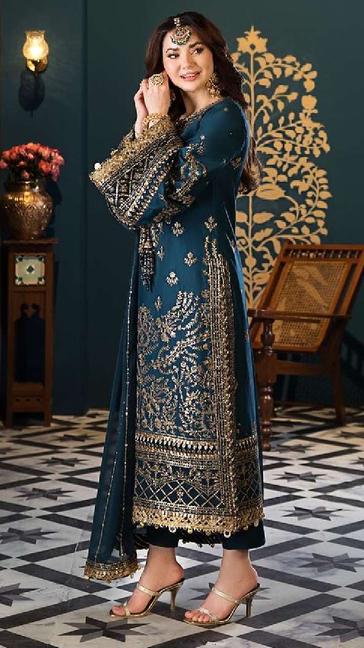 अगर आप वलीमे में ट्रेडिशनल और ग्लैमरस लुक चाहती हैं, तो हानिया आमिर का यह हल्का शिमरी और एंब्रॉयडरी सूट एक बेहतरीन चॉइस हो सकता है। इस सूट में एंब्रॉयडरी के साथ नेट फिनिश आपके लुक को एकदम रॉयल बना देगा। इस सूट को आप किसी की भी शादी या वलीमे में पहन सकती हैं और यह आपको एक क्लासी और ग्रेसफुल लुक देगा।