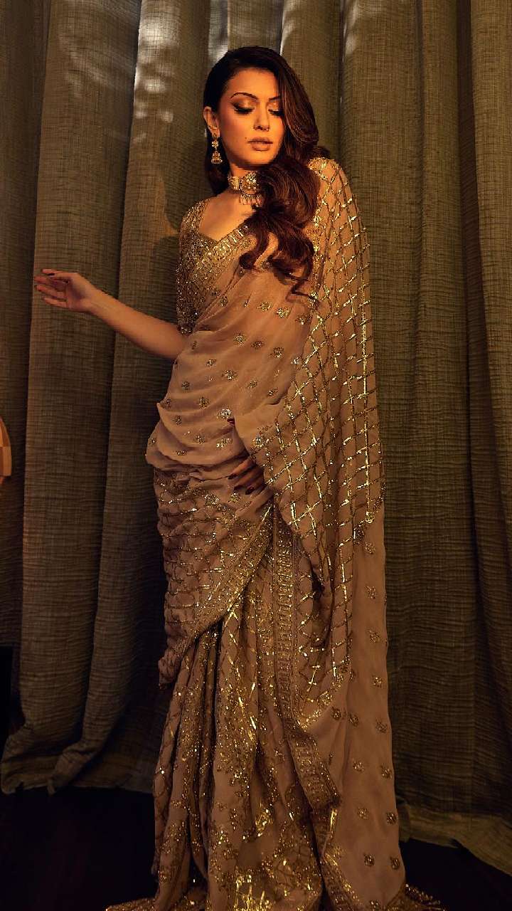 हंसिका मोटवानी के पास साड़ी का शानदार कलेक्शन है। आप भी इस तरह की साड़ी को रिसेप्शन पार्टी में कैरी कर सकती हैं।