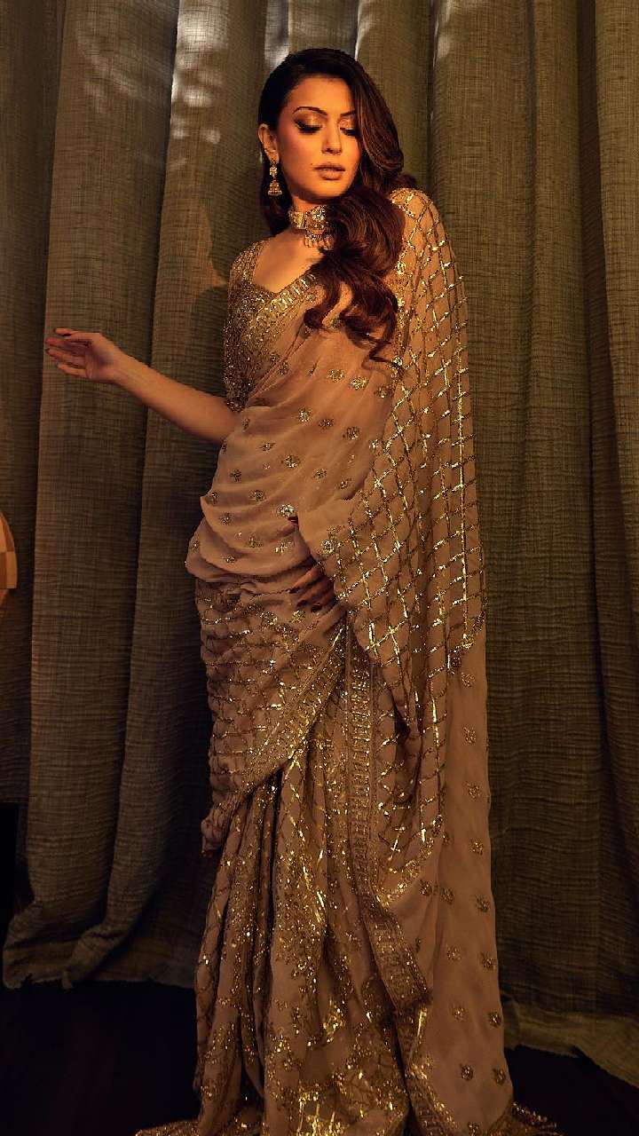 हैवी साड़ी की तलाश है तो एक्ट्रेस की गोल्डन सीक्वेन वर्क साड़ी कैरी कर सकती हैं। इस तरह की साड़ी में आपका फिगर काफी उभर कर आएगा।