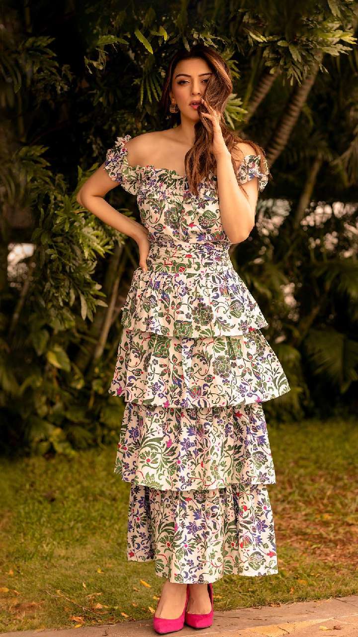 हंसिका का रफल स्टाइल प्रिंटेड ऑफ शोल्डर कॉटन गाउन काफी खूबसूरत लग रहा है। कॉकटेल पार्टी के लिए ये बेस्ट लुक है।