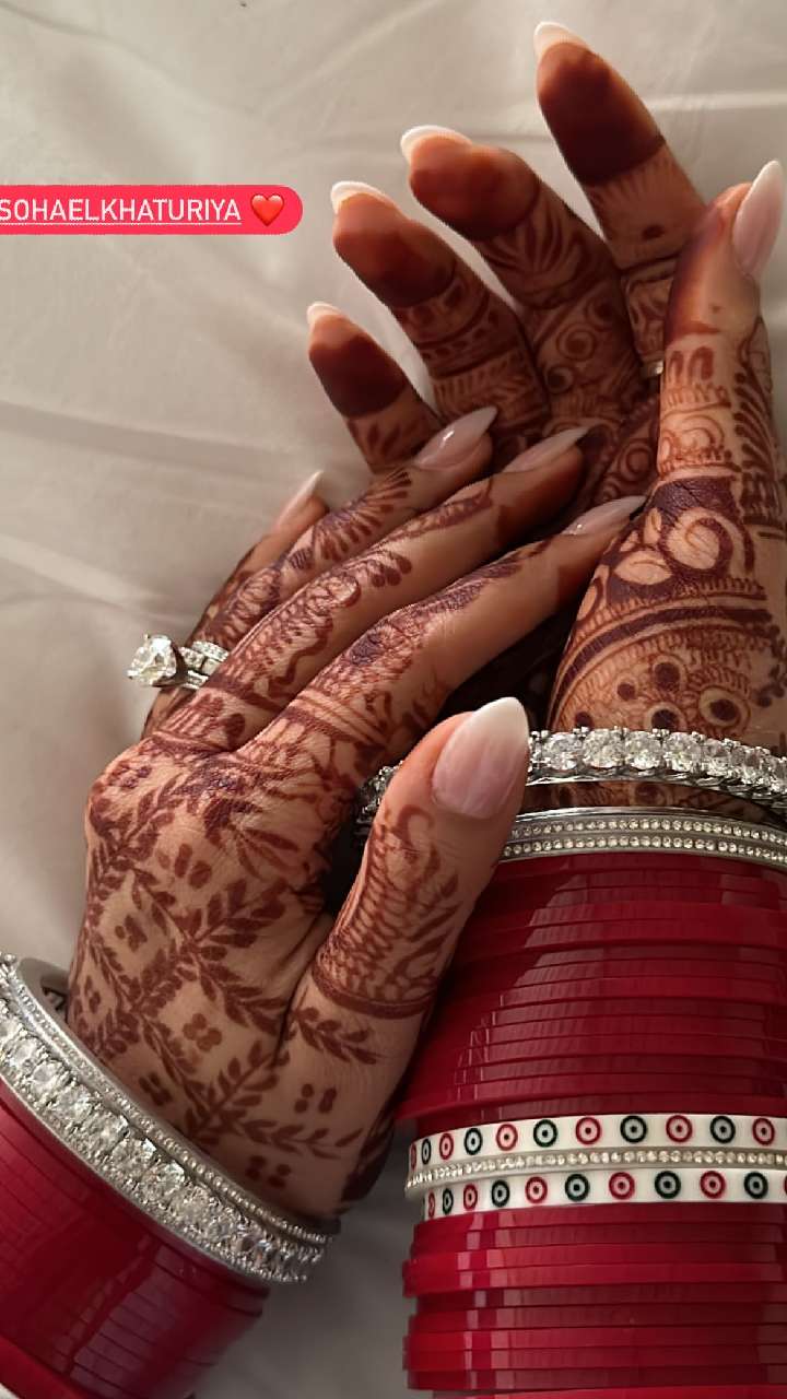 एक्ट्रेस ने सोहेल के नाम की मेहंदी रचाई, जिसकी फोटो उन्होंने शेयर की।