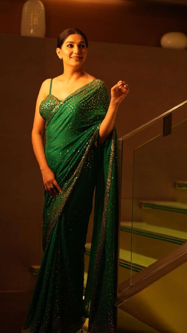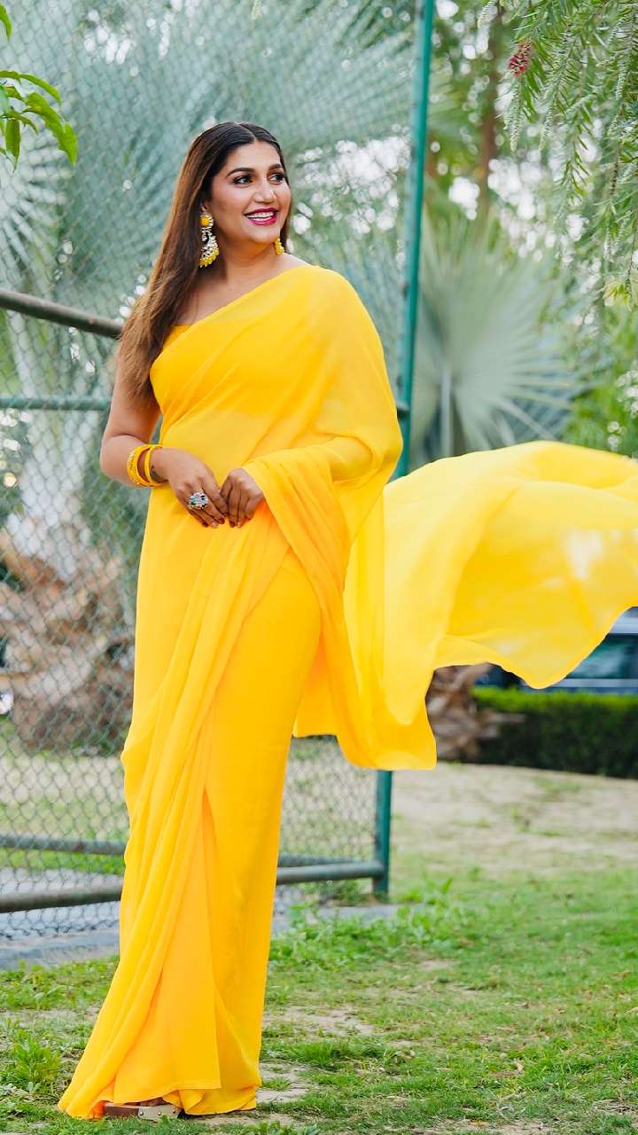 सपना चौधरीका ये प्लेन साड़ी लुक काफी ज्यादा शानदार लग रहा है। सिंपल सोबर लुक कैरी करने के लिए आप प्लेन साड़ी कॉपी करें।