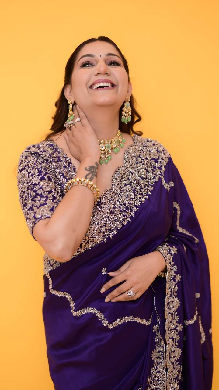 पर्पल कलर की साड़ी में सपना चौधरी काफी ज्यादा शानदार लग रही हैं। आप इस तरह की हैवी बॉर्डर साड़ी में खूब सुंदर लगेंगी।
