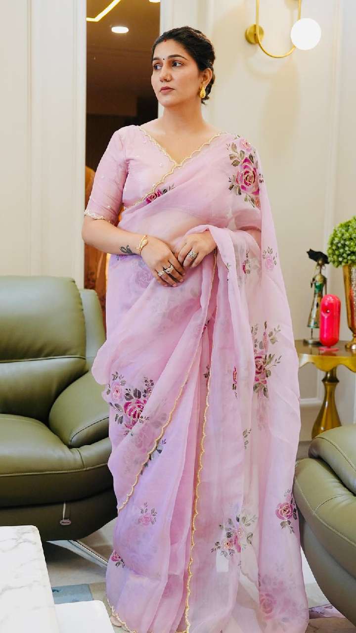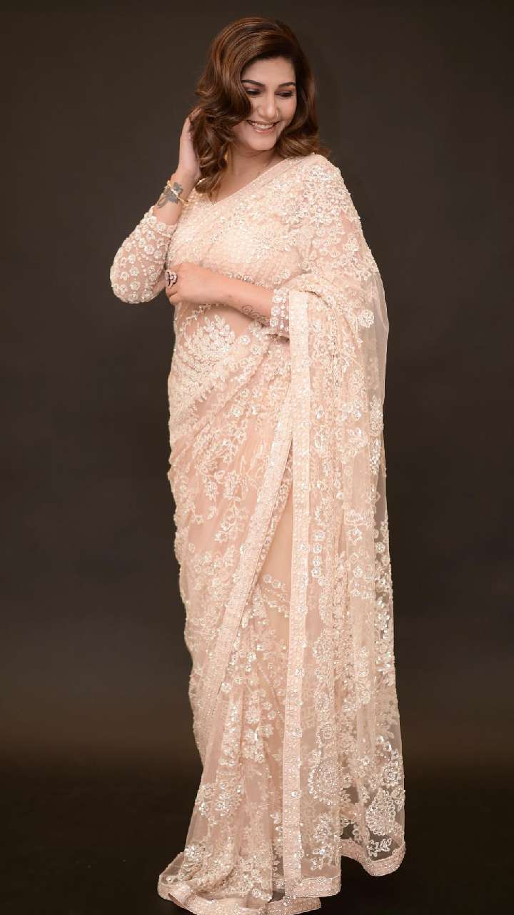 अगर आप अपने पार्टी लुक में चार चांद लगाना चाहती हैं तो आप सपना चौधरी की तरह ही नेट वर्क साड़ी स्टाइल करें।