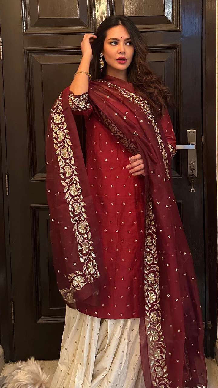 ईशा गुप्ता मरून और व्हाइट कॉम्बिनेशन वाले शरारा सूट में खूबसूरत लग रही हैं। ऐसे सूट नई दुल्हन फेस्टिवल पर जरूर ट्राई करें।