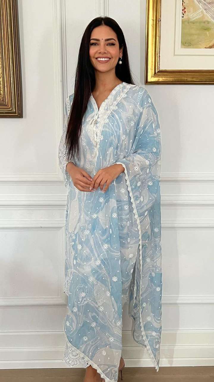 एक्ट्रेस का प्रिंटेड स्काई ब्लू कॉटन पेंट सूट काफी प्रिटी लुक दे रहा है। ऐसे सूट न्यूली मैरिड के लिए बेस्ट ऑप्शन रहता है।
